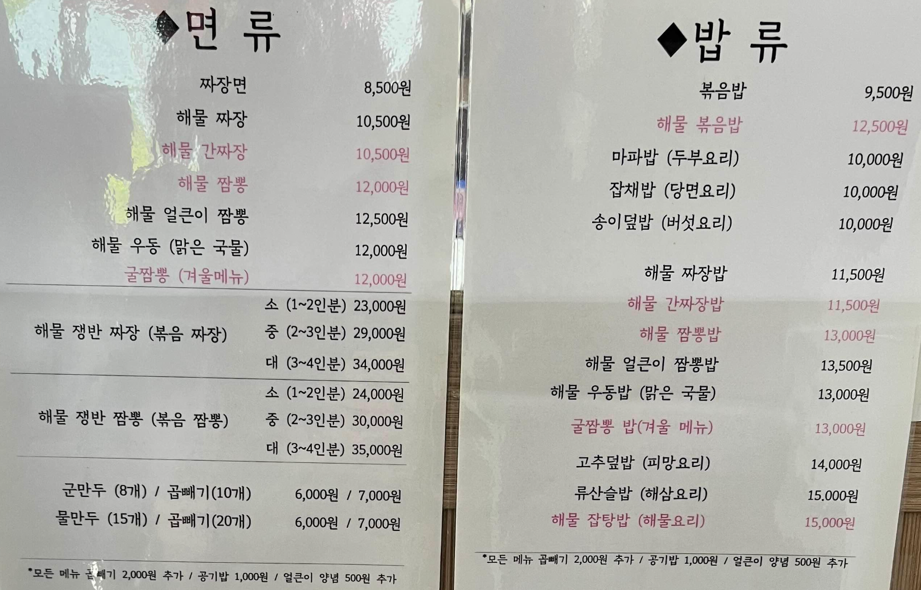 해물짬뽕의 국물은 진하고, 제 입맛으로는 약간 맵게 느껴졌는데요. 맛있는 매운맛이라서 자꾸만 숟가락을 들게 되더라고요. 메뉴판에 해물 얼큰이 짬뽕 메뉴도 있던데, 그 메뉴에는 청양고추가 많이 들어간다고 하네요.