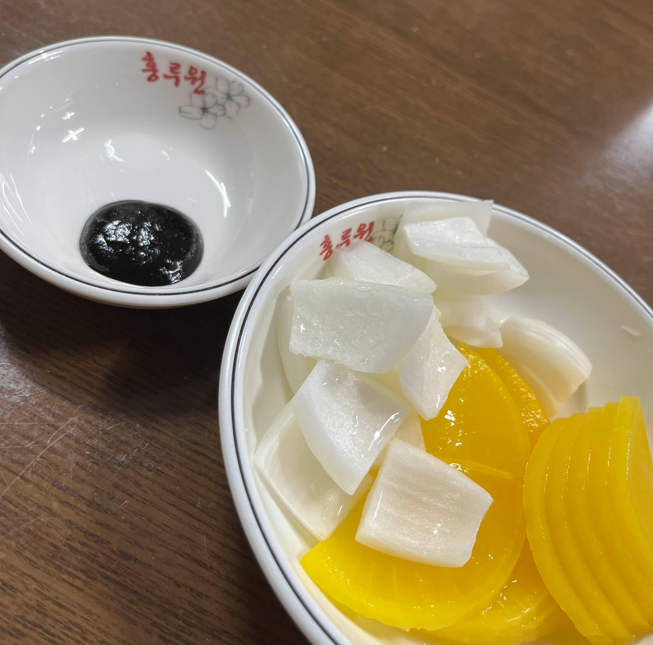 테이블에 앉으면 직원 분께서 단무지와 양파를 갖다 주시는데요. 모든 테이블 위에도 단무지와 양파를 담은 반찬통이 놓여 있어서, 드시다 부족하시면 편하게 덜어 드실 수 있으세요.