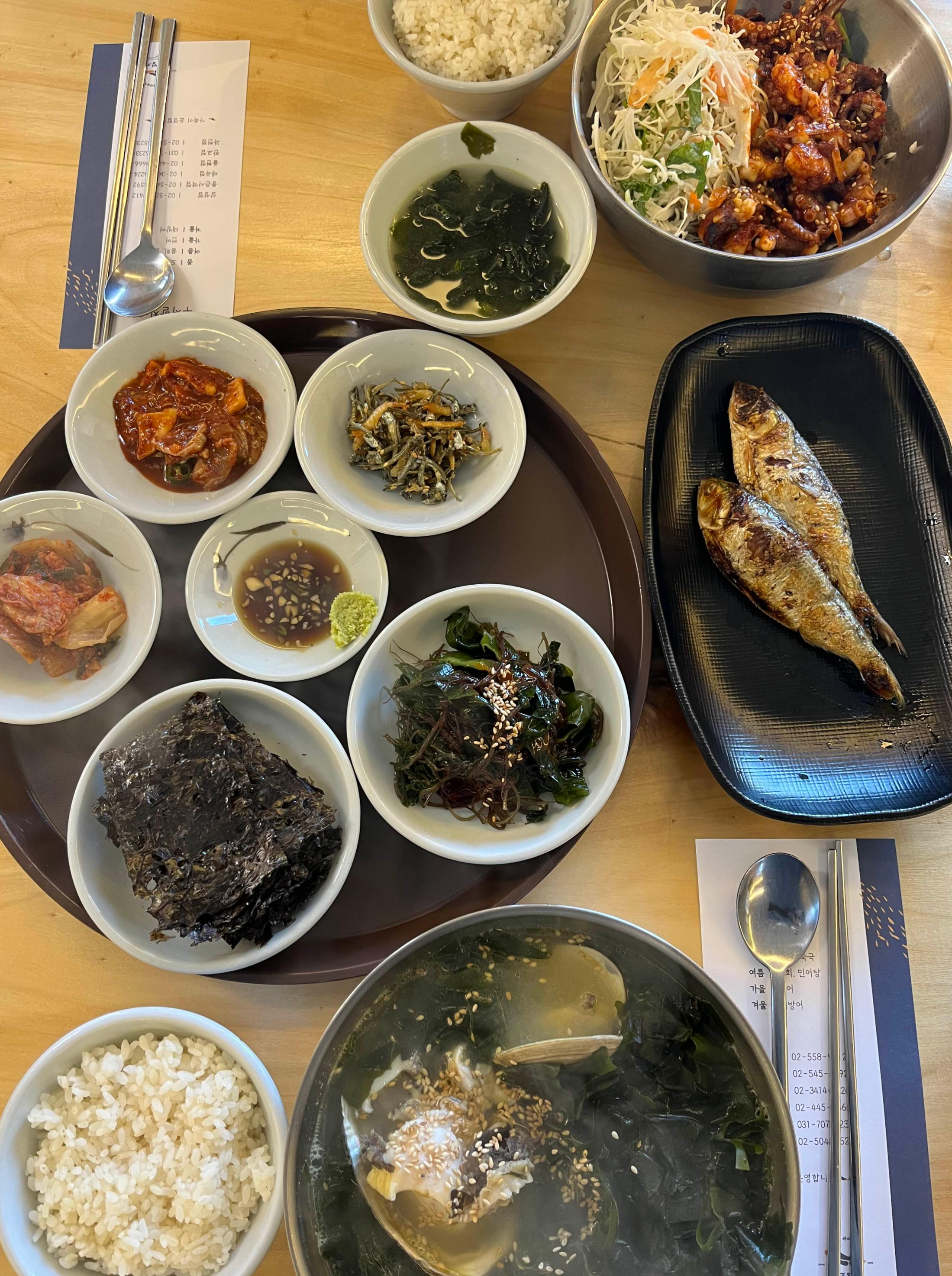 선배는 통낙지비빔밥을, 그리고 저는 전복미역국을 선택했고요. 전어구이도 두 마리 함께 주문했습니다.