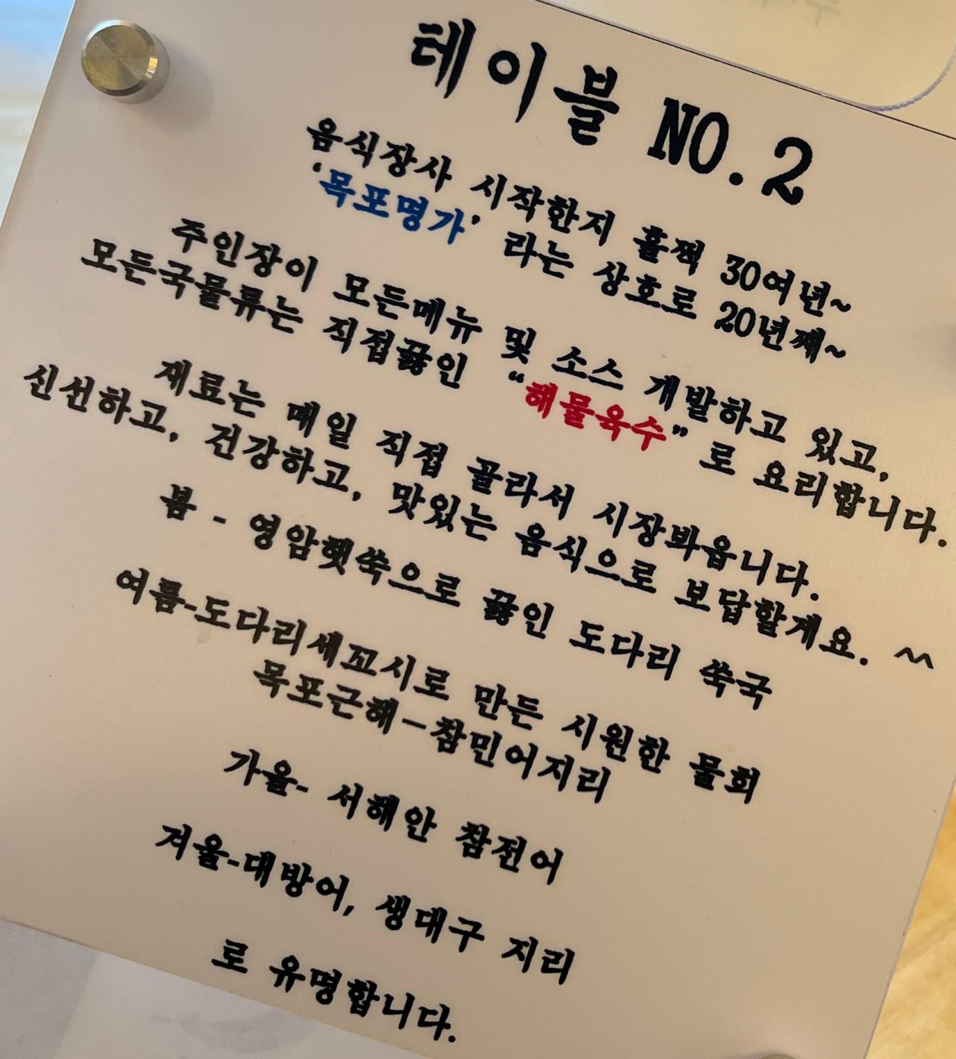 맛이 없을지라도 김치를 직접 담근다는 문구가 재밌네요. 목포명가는 주인장이 모든 메뉴 및 소스를 개발하고 있고, 모든 국물류는 직접 끓인 해물육수로 요리한다고 안내되어 있었습니다.