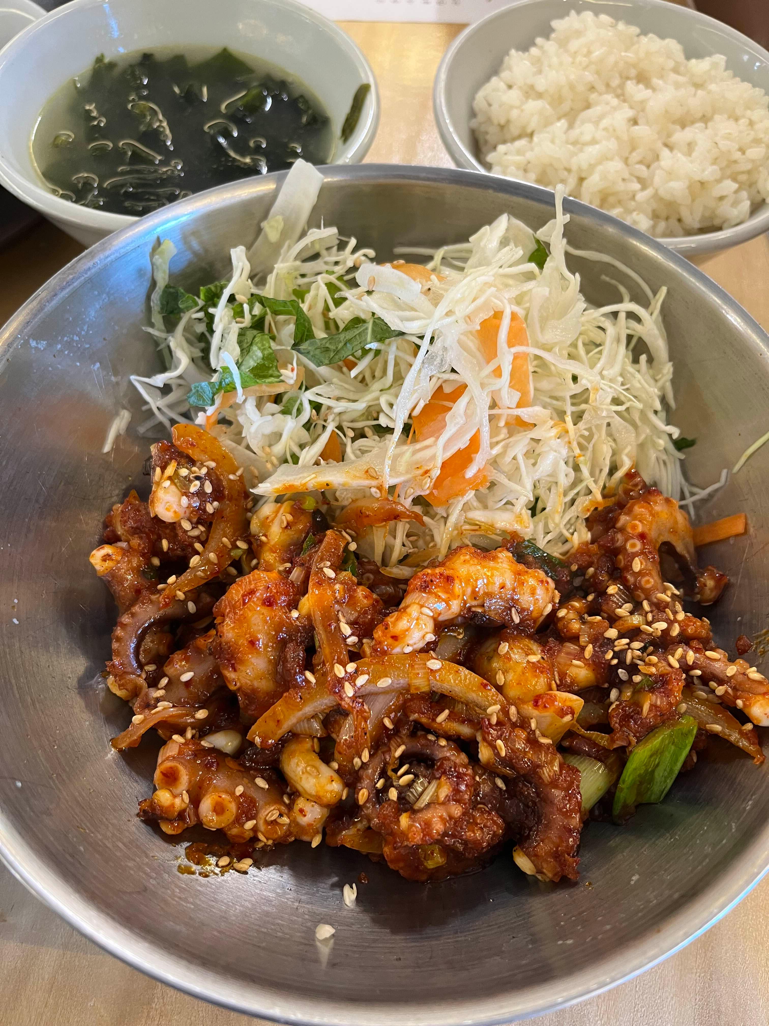 선배가 맛보라고 통낙지비빔밥을 조금 덜어줬는데요. 낙지가 보드랍고, 양념장 향이 독특했어요.
