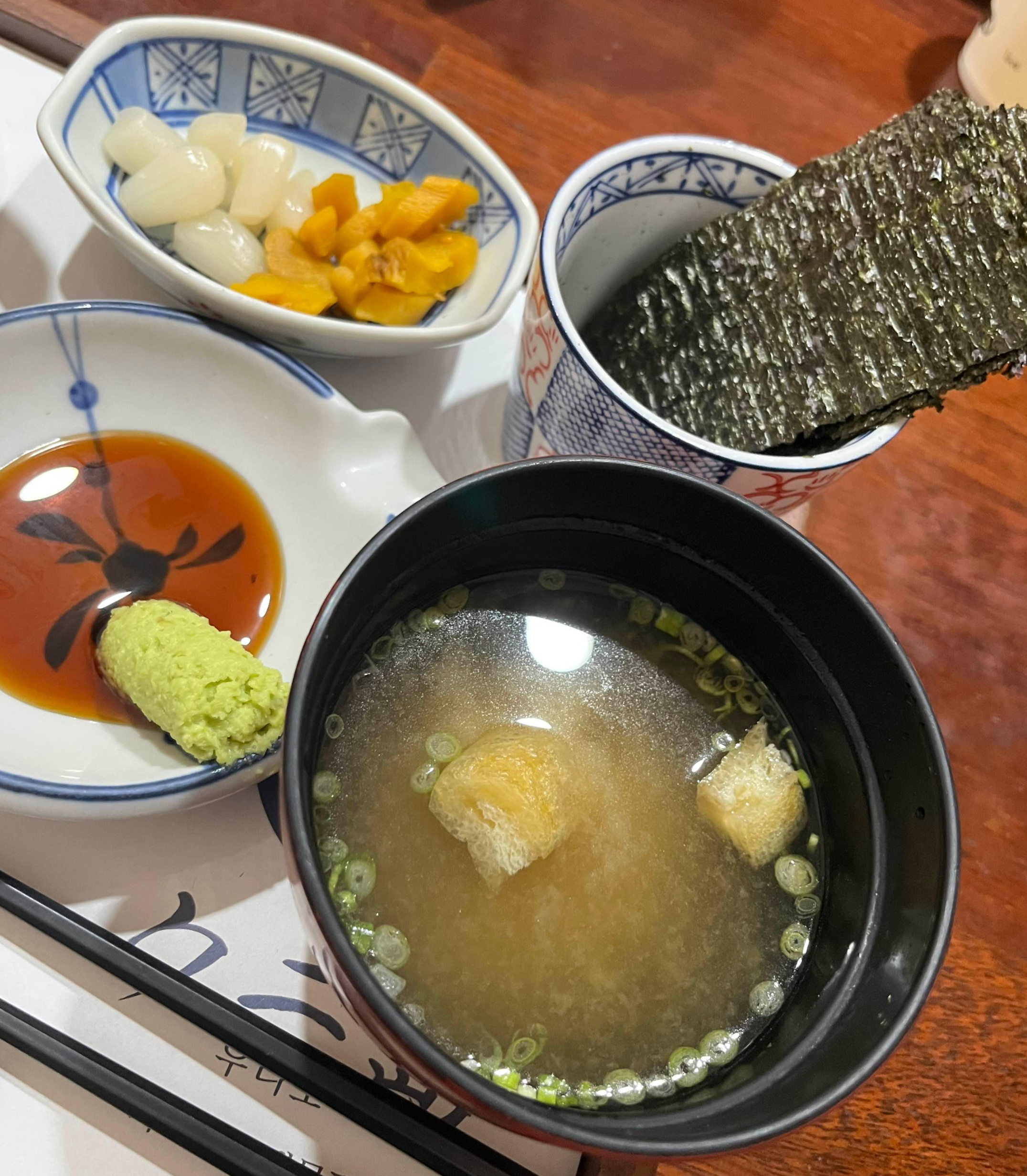남도에서 공수한 고급김에 짜지 않은 수제간장과 생고추냉이를 곁들여 드시면 더욱 맛있게 드실 수 있으십니다. 계절별 수급 사정에 따라 재료들이 일부 변동될 수는 있지만요.