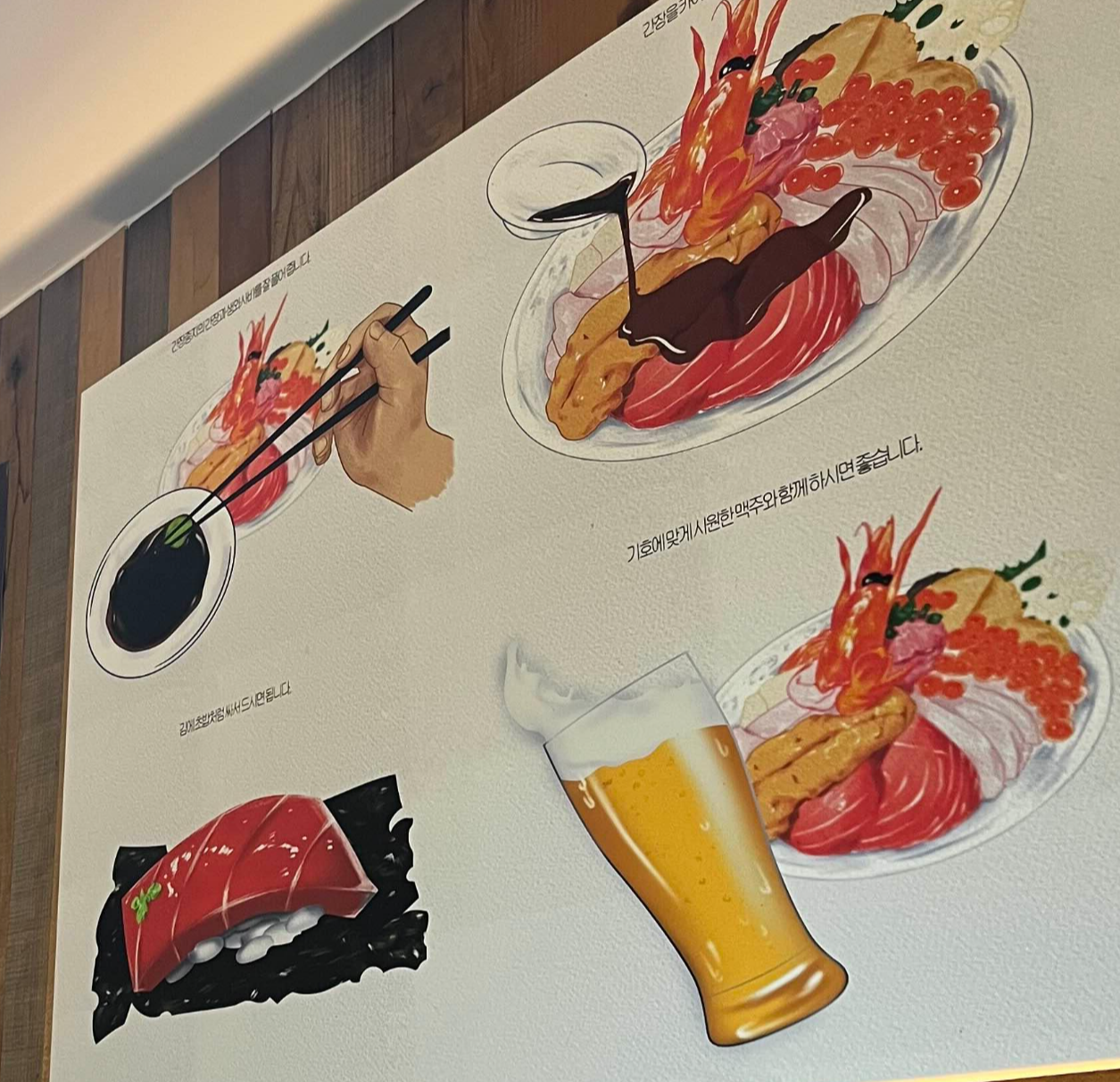우니도 벽면에는 카이센동을 더욱 맛있게 먹을 수 있는 꿀팁도 안내되어 있는데요. 간장과 생고추냉이를 잘 풀어준 다음에 카이센동에 뿌려줍니다. 김에 초밥처럼 싸서 먹어도 맛있고, 기호에 맞게 생맥주와 함께 먹어도 좋다고 하네요.
