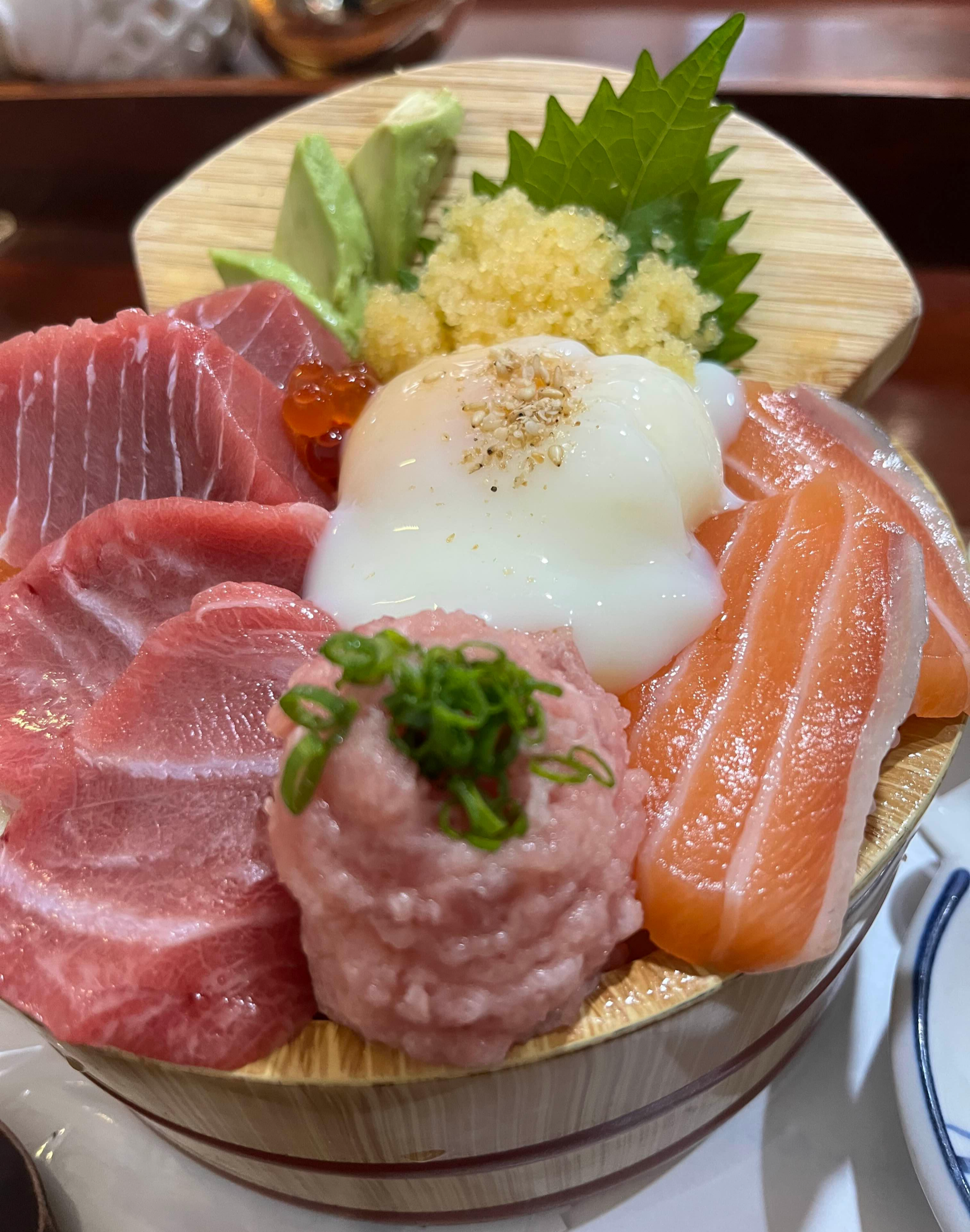 혼마구로사케동은 참다랑어속살과 뱃살, 생연어, 날치알, 명란네기토로, 아보카도, 아쿠라 등 위에 수제 수란이 올라가 있습니다. 회가 두툼하니 먹기에 딱 좋고, 식감도 아주 입맛에 잘 맞습니다.