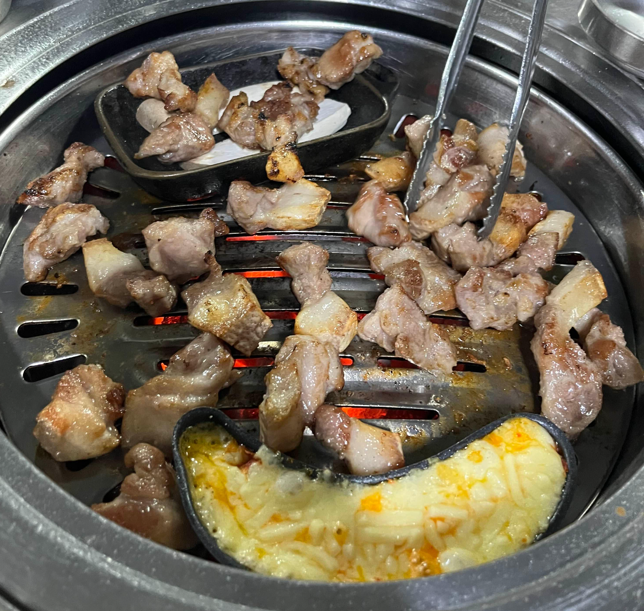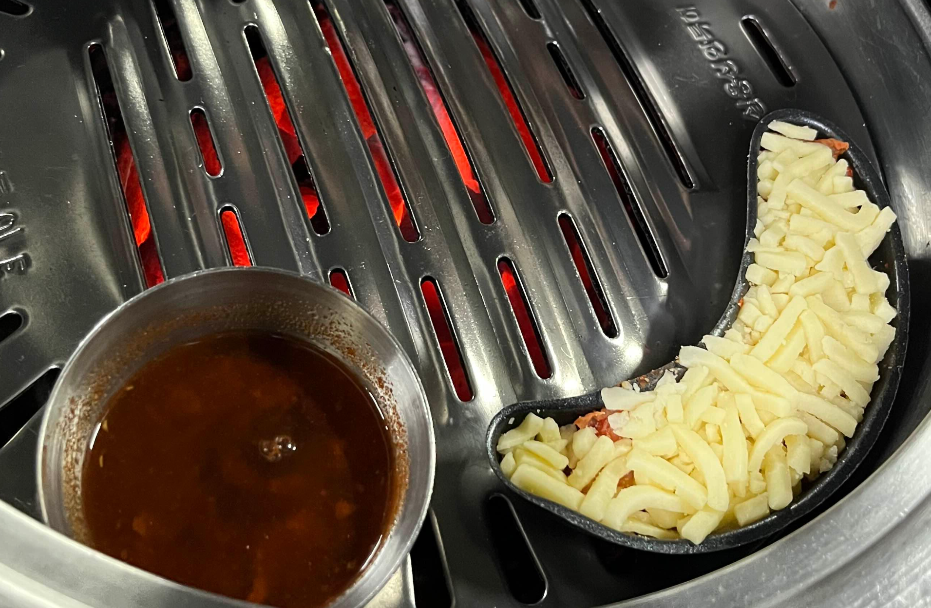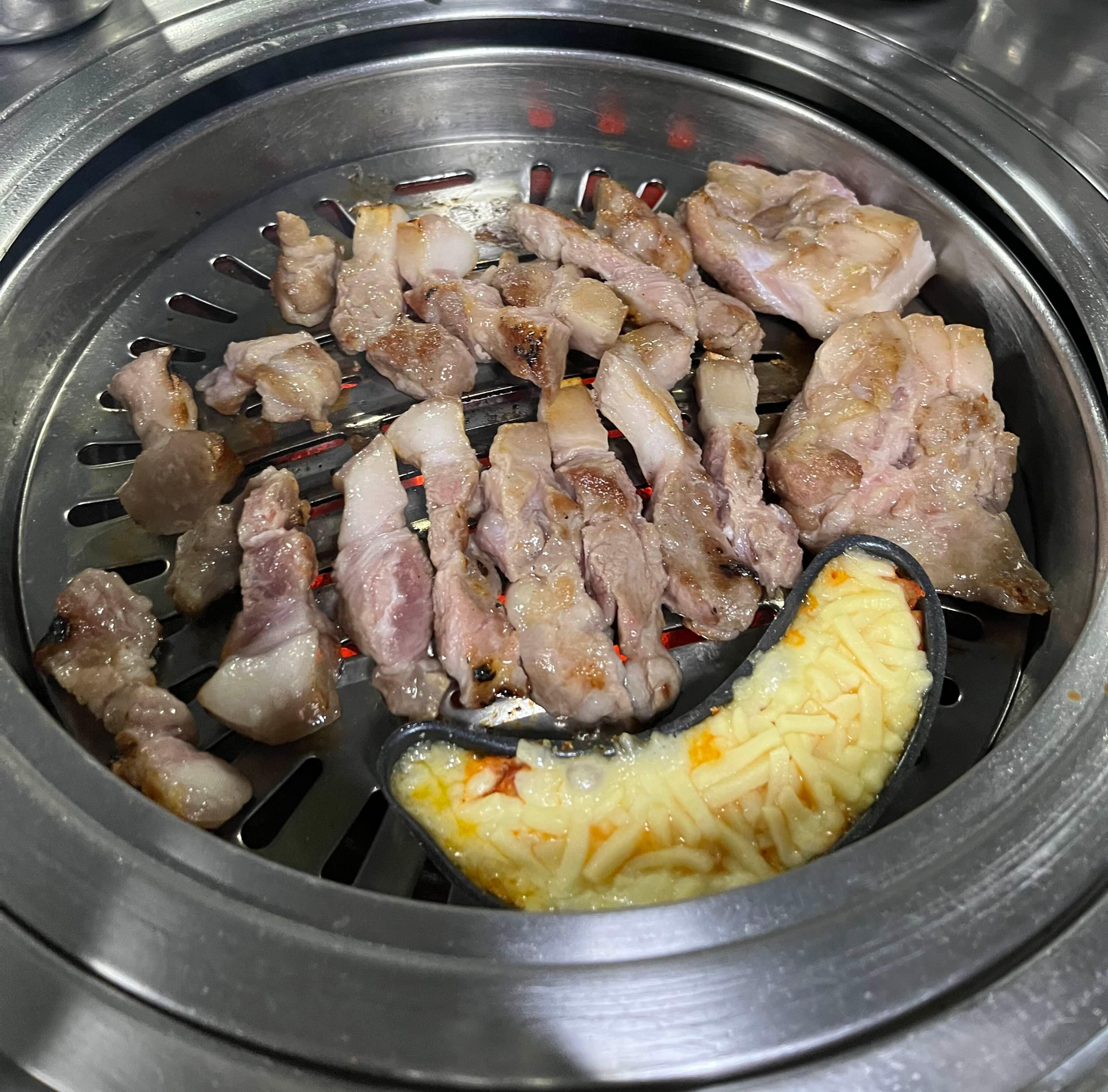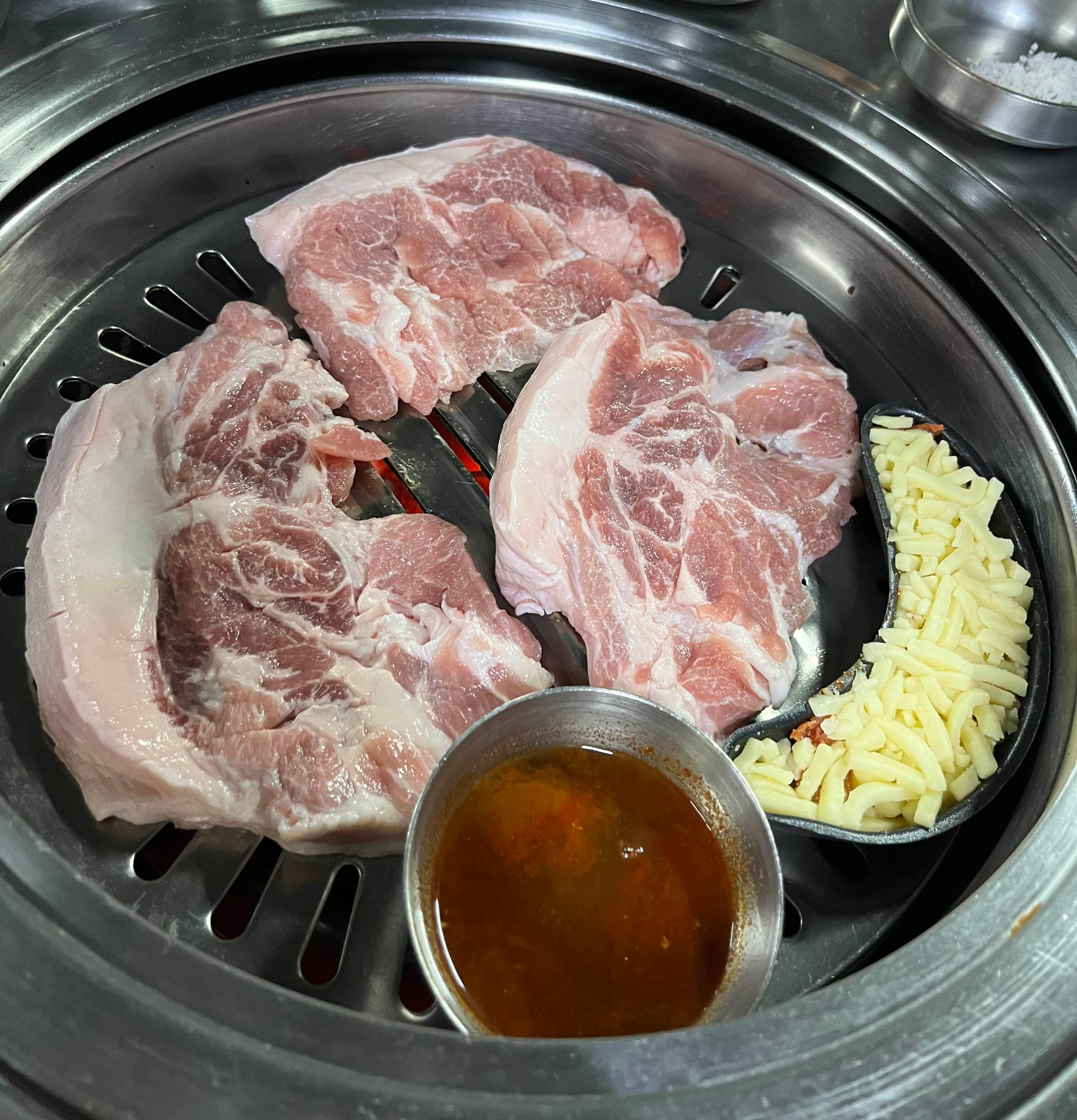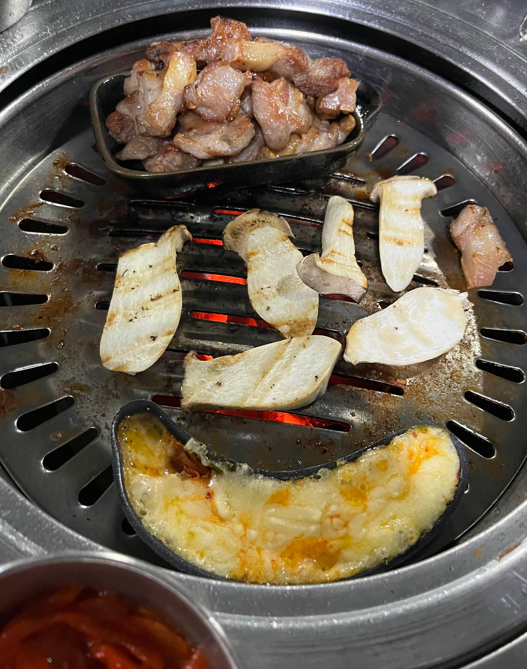 불판 위에 놓인 멜젓과 치즈가 보이는데요. 팽이버섯과 치즈 등은 무한리필이 됩니다. 이날은 따로 주문하지 않았지만, 추억의 도시락 같은 복고풍 메뉴도 있어 재밌게 즐길 수 있어요.