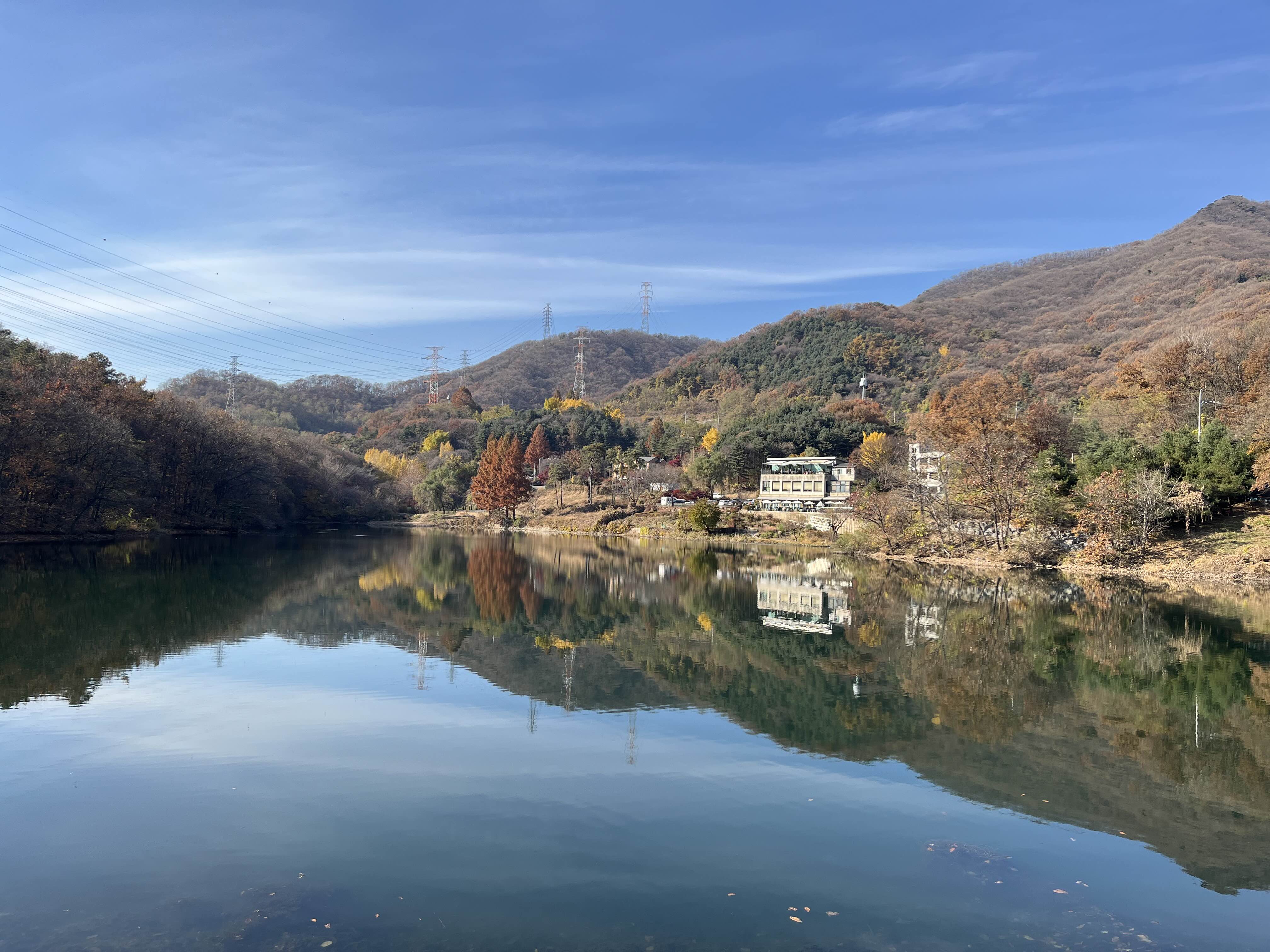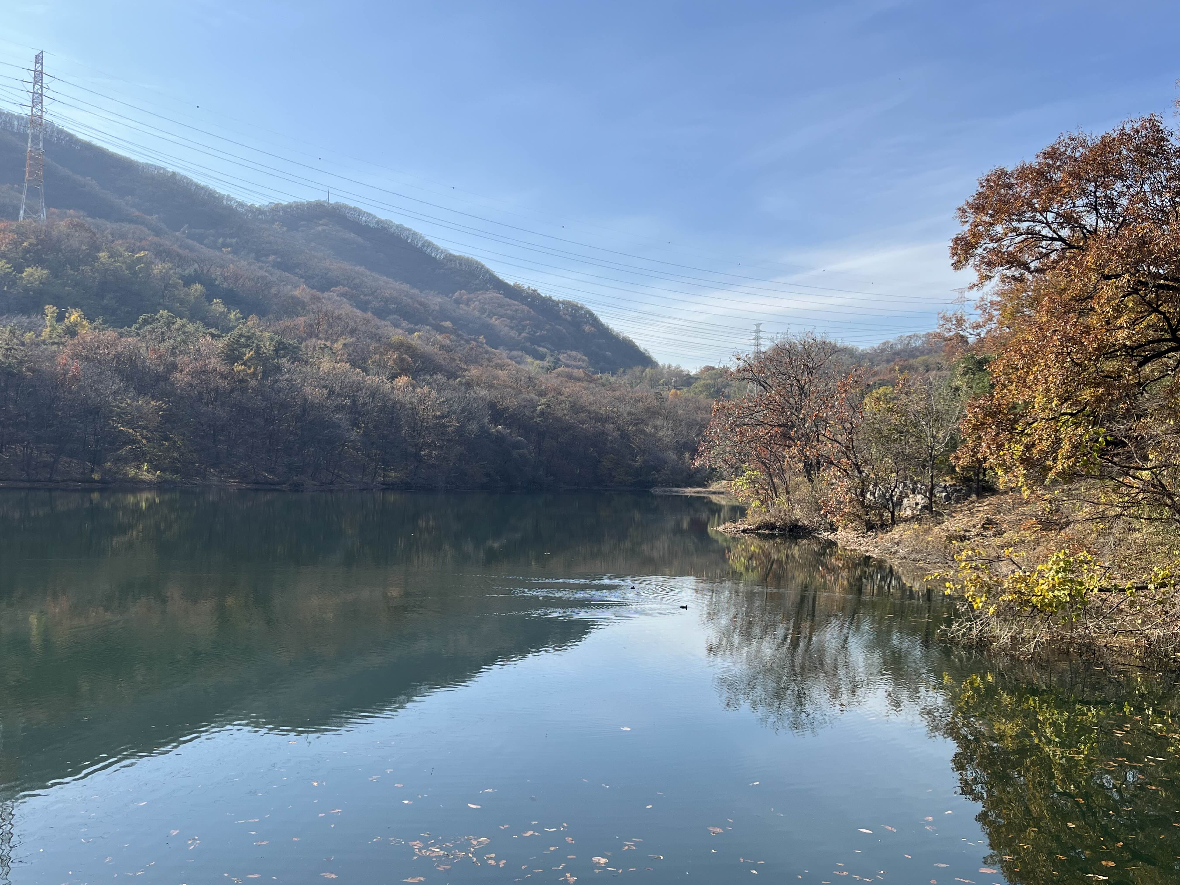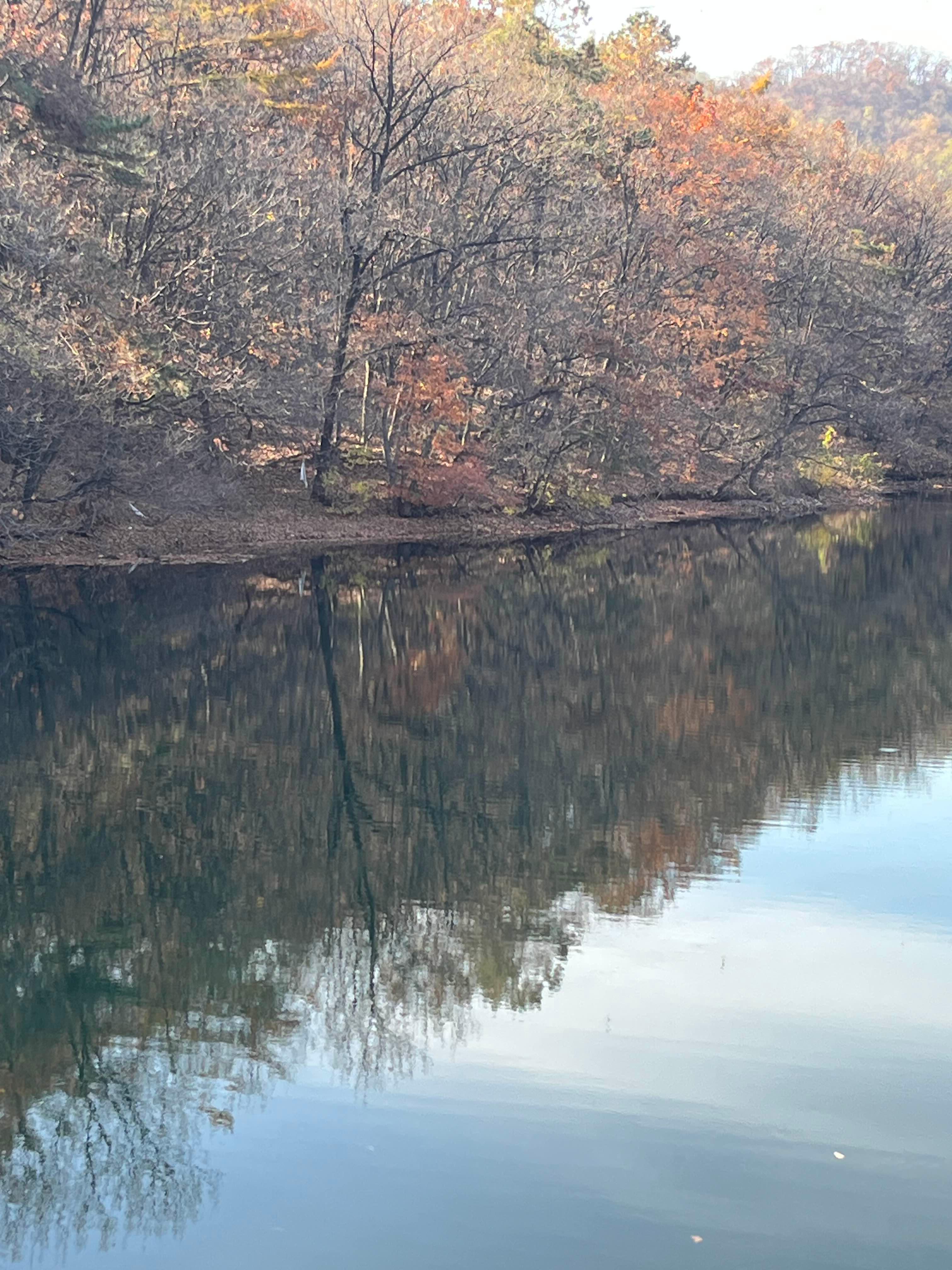 그리 크지 않은 아담한 규모의 운중저수지는 한국학중앙연구원 맞은편에 자리해 있습니다. 남편과 함께 양과창 양평해장국에서 점심을 먹고 난 후 너무 배가 불러서 소화도 시킬 겸 운중저수지를 걸었는데요. 이곳 운중저수지 물가에 가을빛이 살포시 내려앉아 있더라고요.