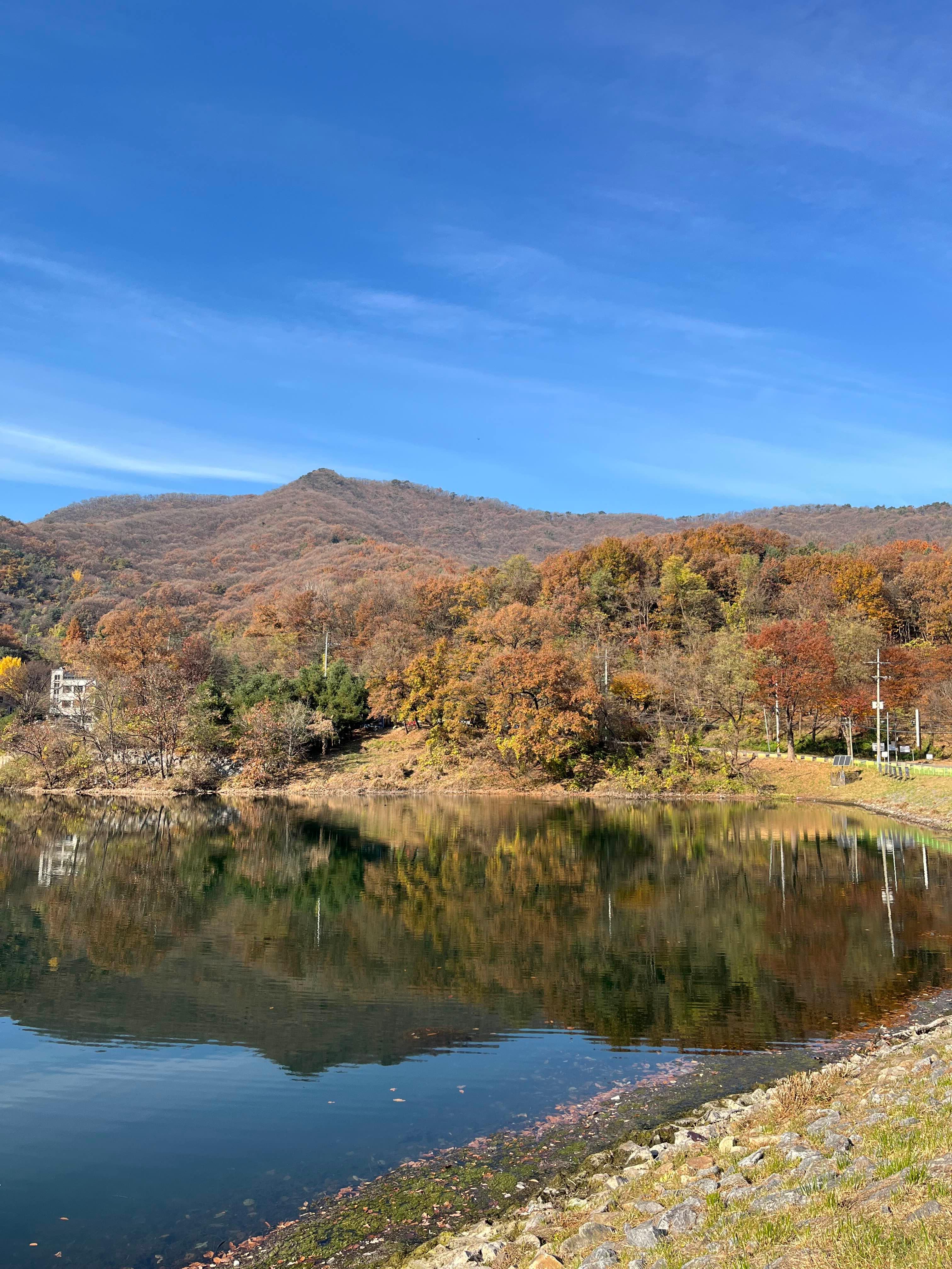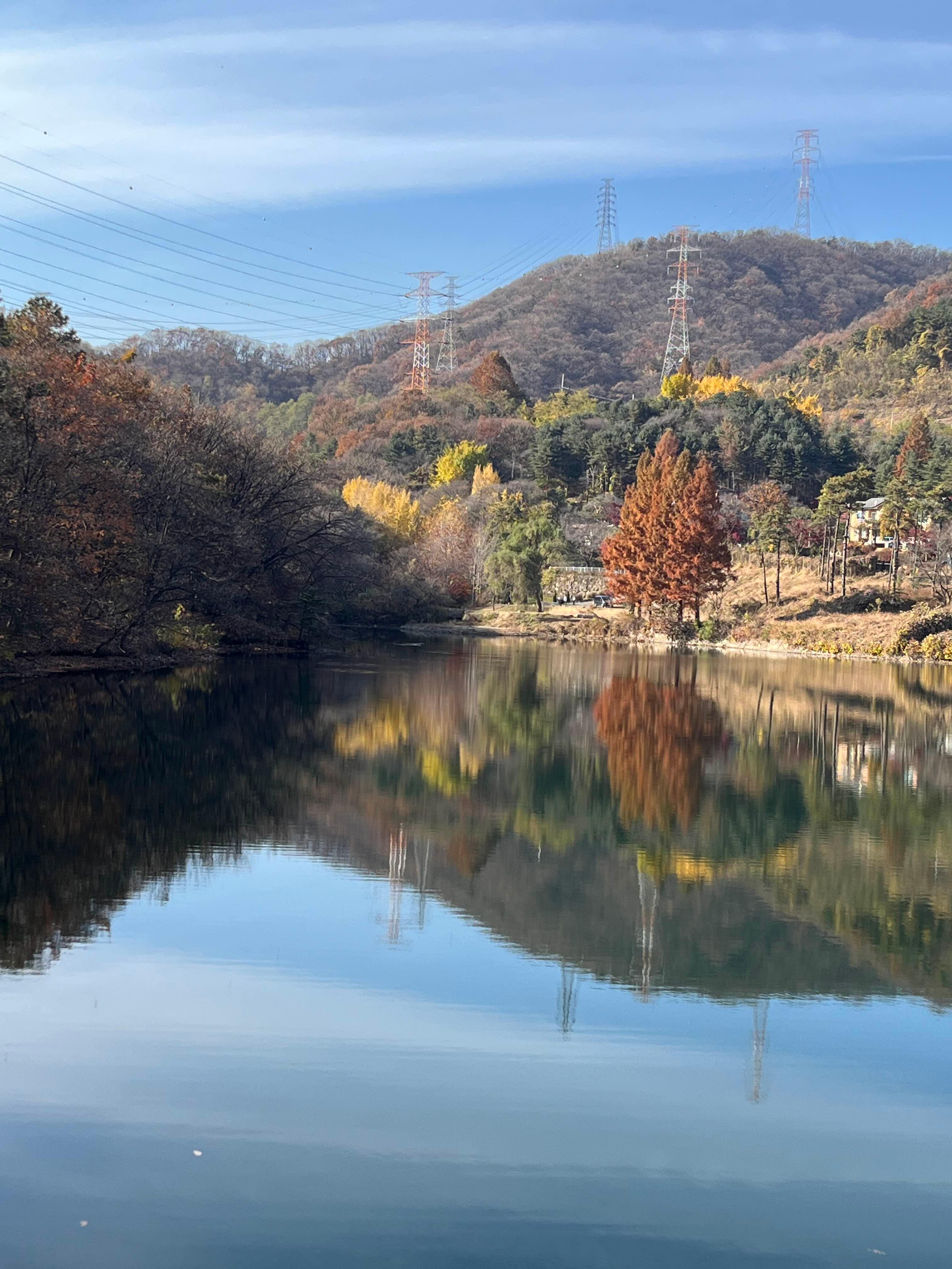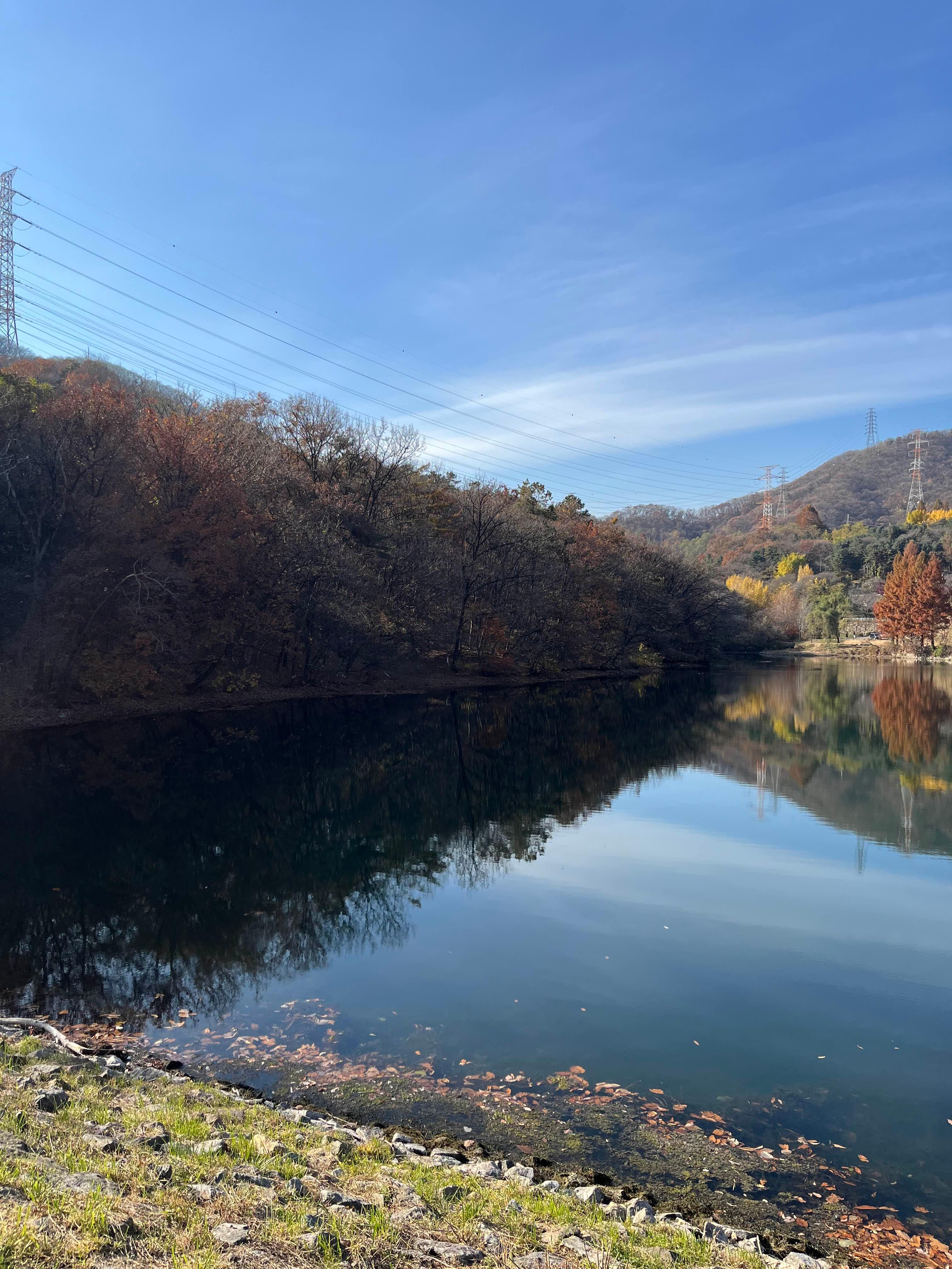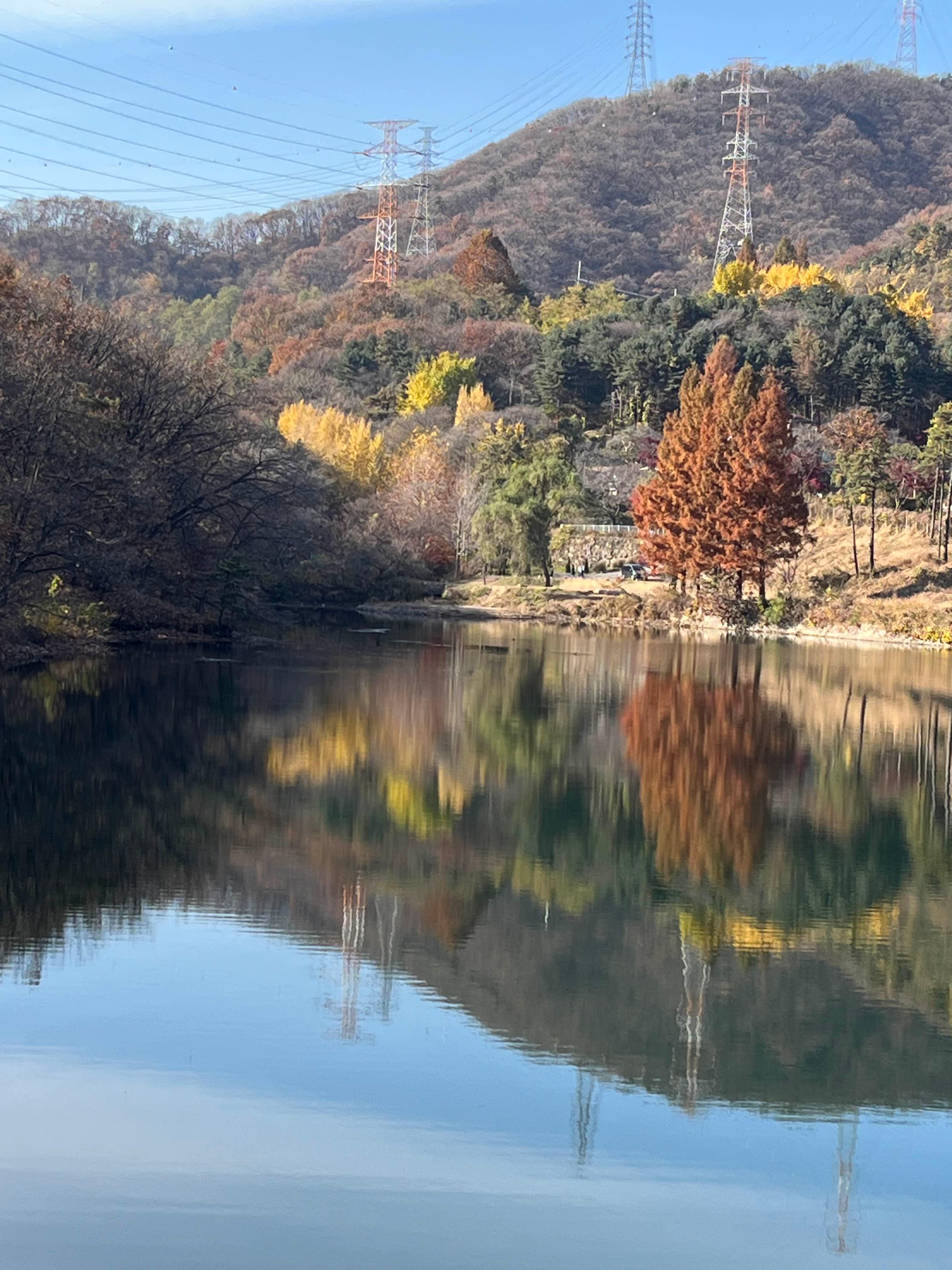 그리 크지 않은 아담한 규모의 운중저수지는 한국학중앙연구원 맞은편에 자리해 있습니다. 남편과 함께 양과창 양평해장국에서 점심을 먹고 난 후 너무 배가 불러서 소화도 시킬 겸 운중저수지를 걸었는데요. 이곳 운중저수지 물가에 가을빛이 살포시 내려앉아 있더라고요.