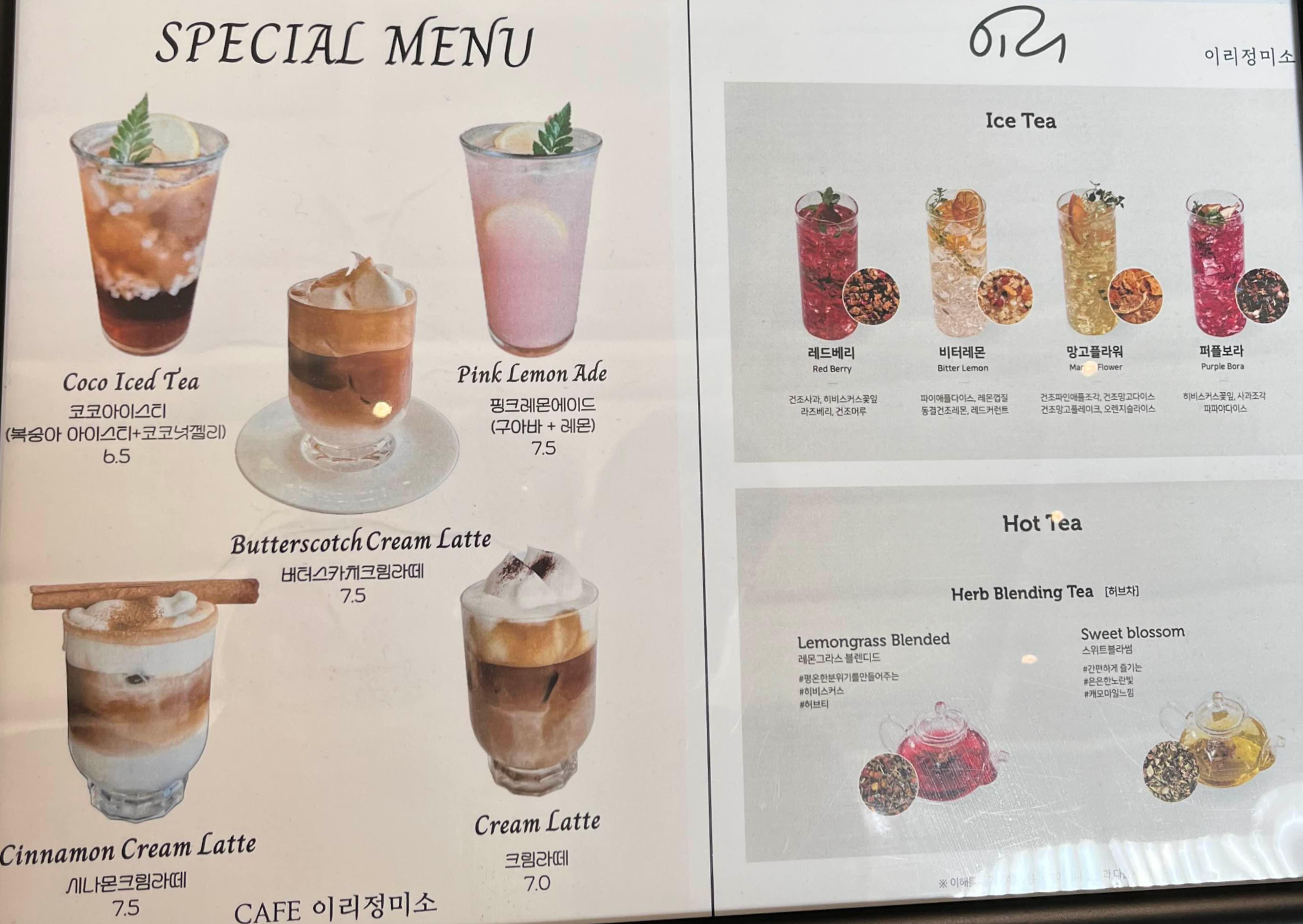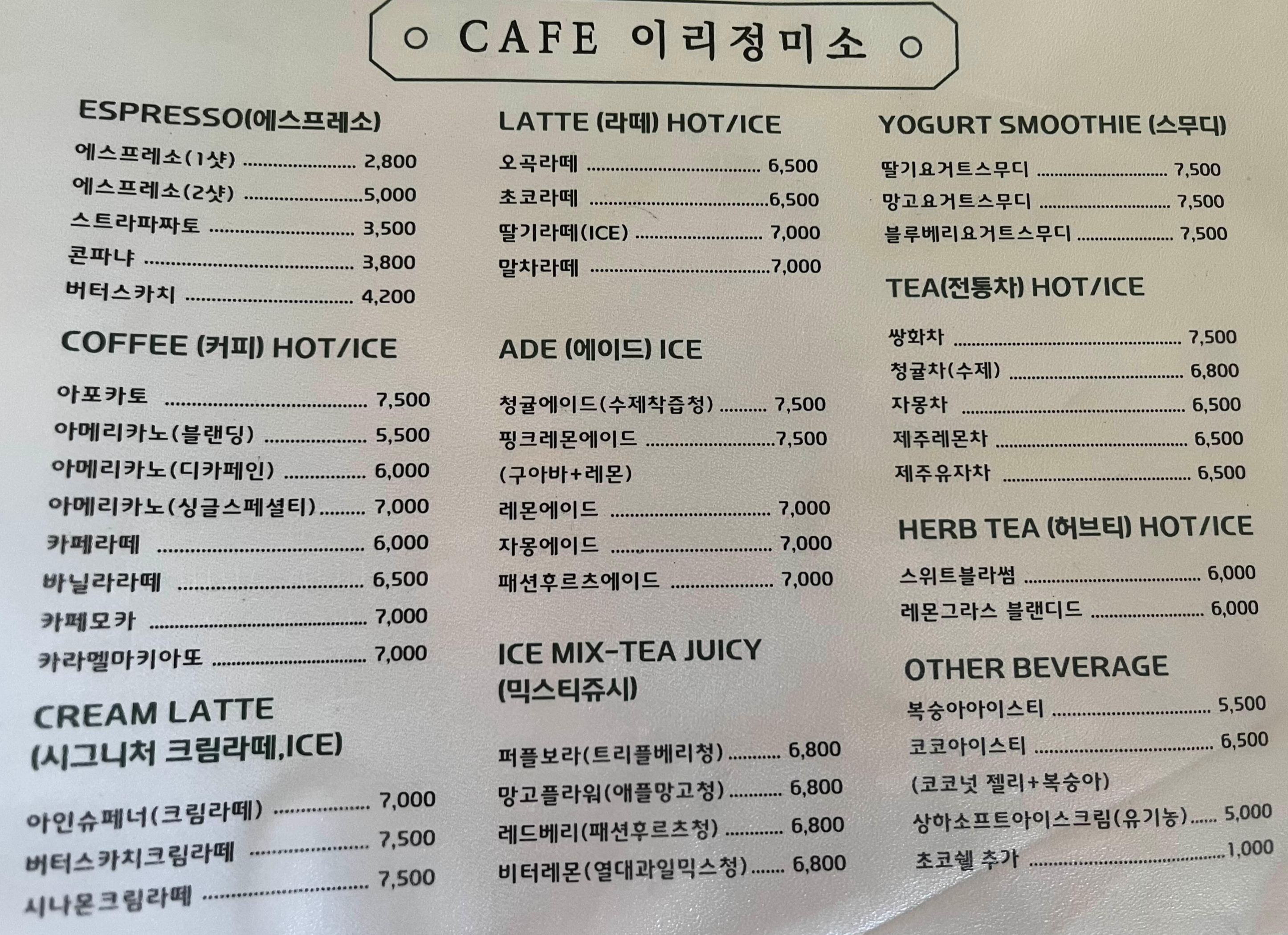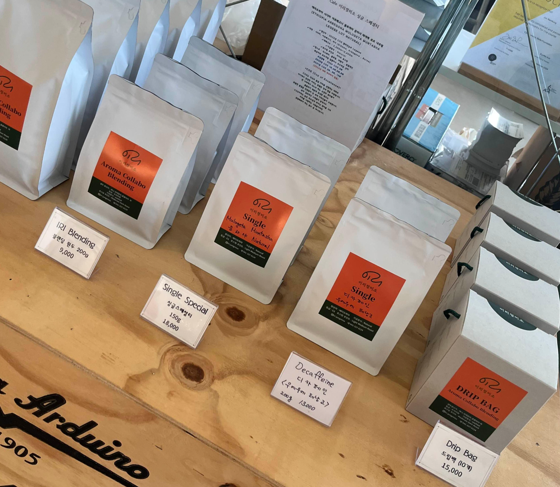 이리정미소는 음료와 디저트들이 다양해서 선택하는 즐거움이 있어요. 로스터실에서 직접 볶은 신선한 원두로 내린 커피를 비롯하여 시그니처크림라떼, 에이드, 스무디, 믹스티쥬시, 전통차 등의 모든 메뉴들이 다 맛나고요. 원두와 드립백도 판매하고 있어요.