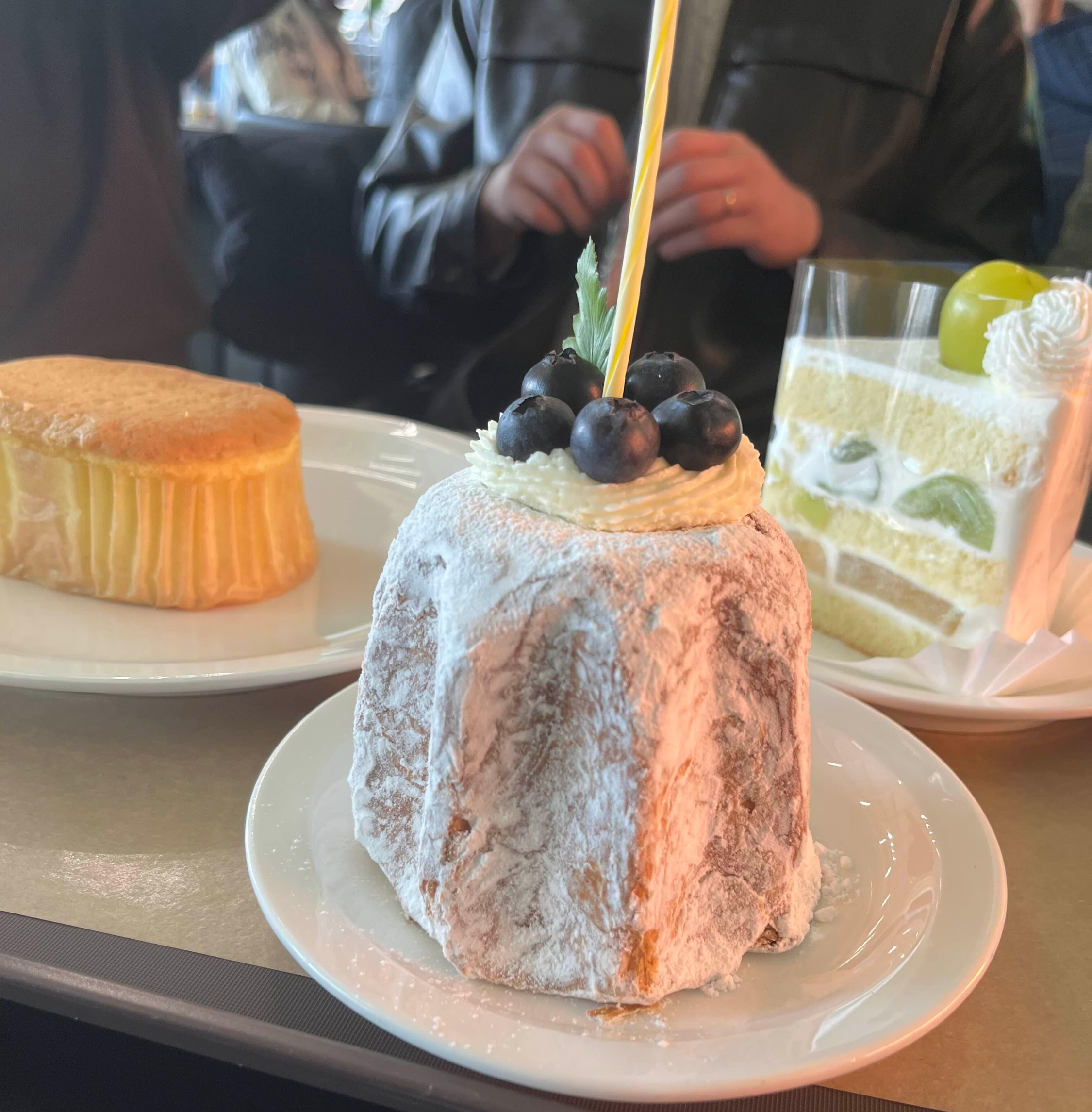 다시 카운터로 가서는 초 두 개를 더 갖고 와서는 디저트 위에 꽂고는 말하네요.