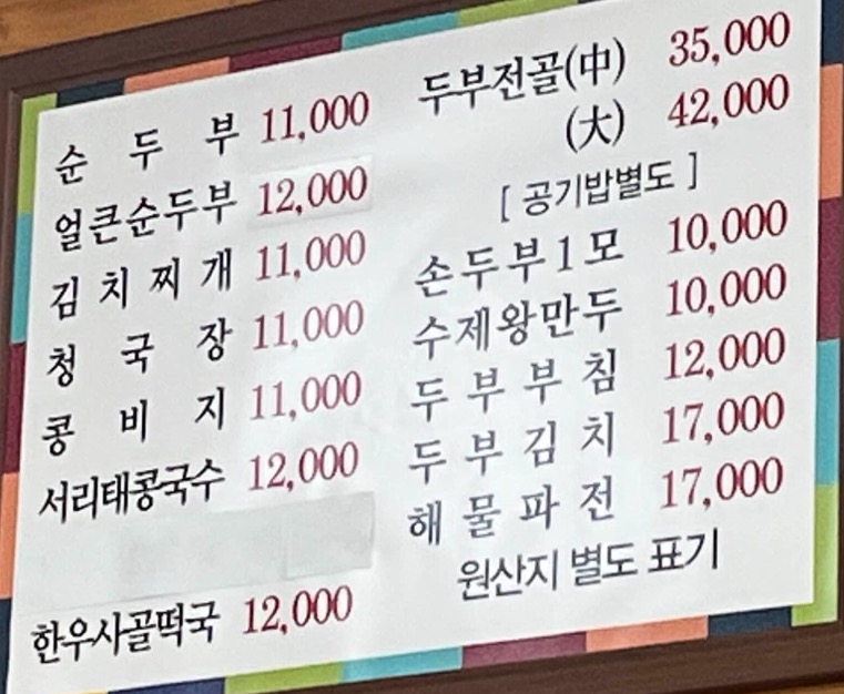 - 메뉴: 순두부, 청국장, 두부전골, 두부김치 등