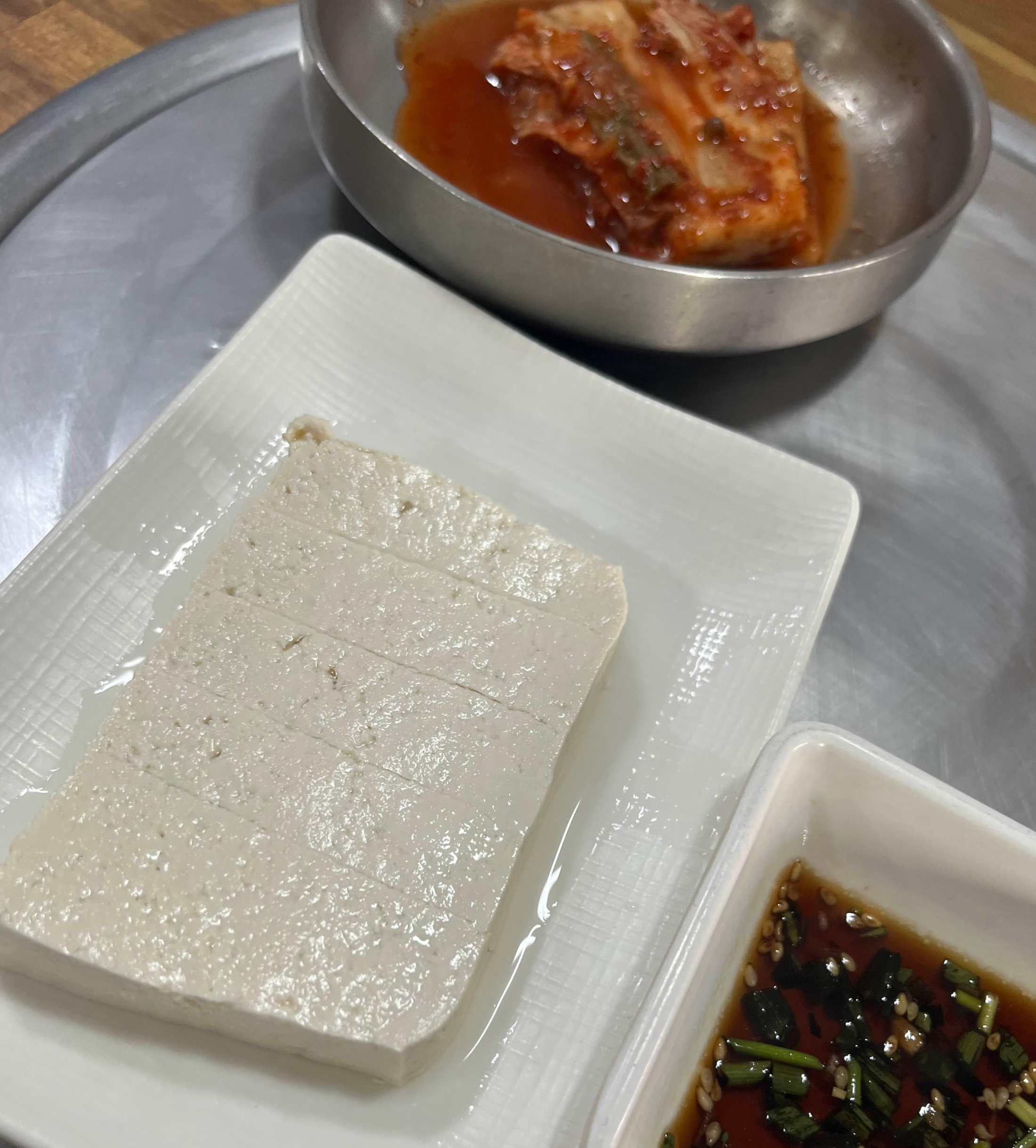 자리에 앉자마자 제일 먼저 따뜻한 손두부가 조금 나와요. 양념간장에 찍어 먹으니 참 맛있더라고요.