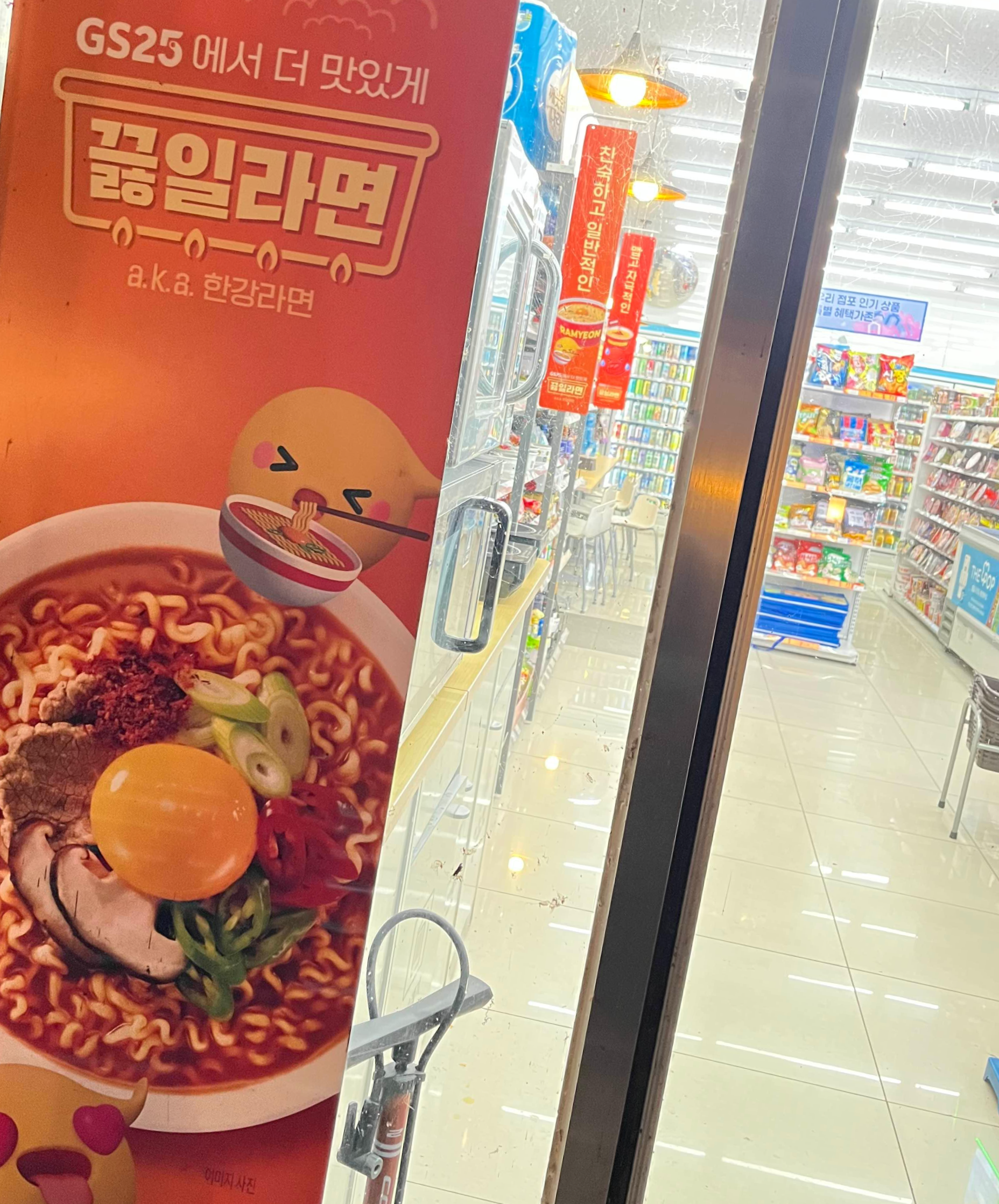 저희들을 유혹한 것은 바로 한강라면이었어요. 한강변에서 자전거를 탈 때 가끔씩 남편과 먹던 바로 그 한강라면을 이렇게 편의점에서 먹을 수가 있더라고요. 이 편의점은 자전거를 타시는 분들이 많이들 쉬었다 가시는 곳이라고 하네요. 그래서 그분들을 위한 휴식공간도 따로 마련되어 있었어요.