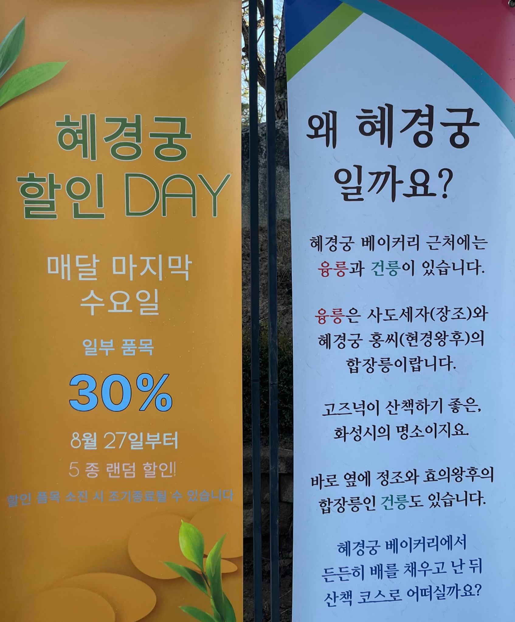 대형 베이커리 카페의 이름이 혜경궁이라고 해서 그 이름을 지은 이유가 궁금했는데요. 카페로 들어서는 정문 옆에 그와 관련된 내용의 안내판이 서 있더라고요.