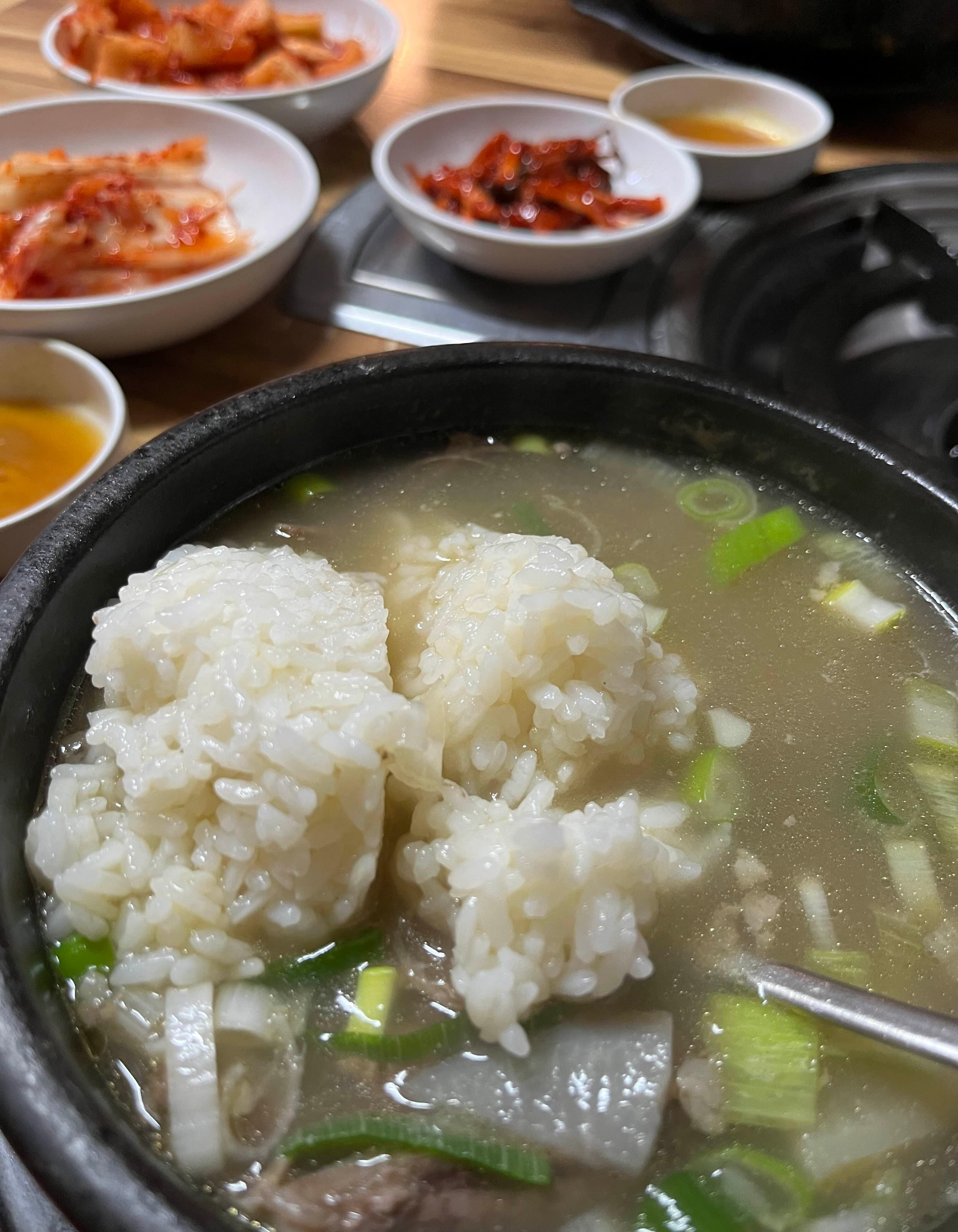 고기를 골라 먹고는, 밥을 말았습니다. 고기가 워낙 듬뿍 들어 있어서 고기만 먹고도 배가 불러왔지만, 그래도 국밥에는 밥을 말아먹어야 제맛이죠.
