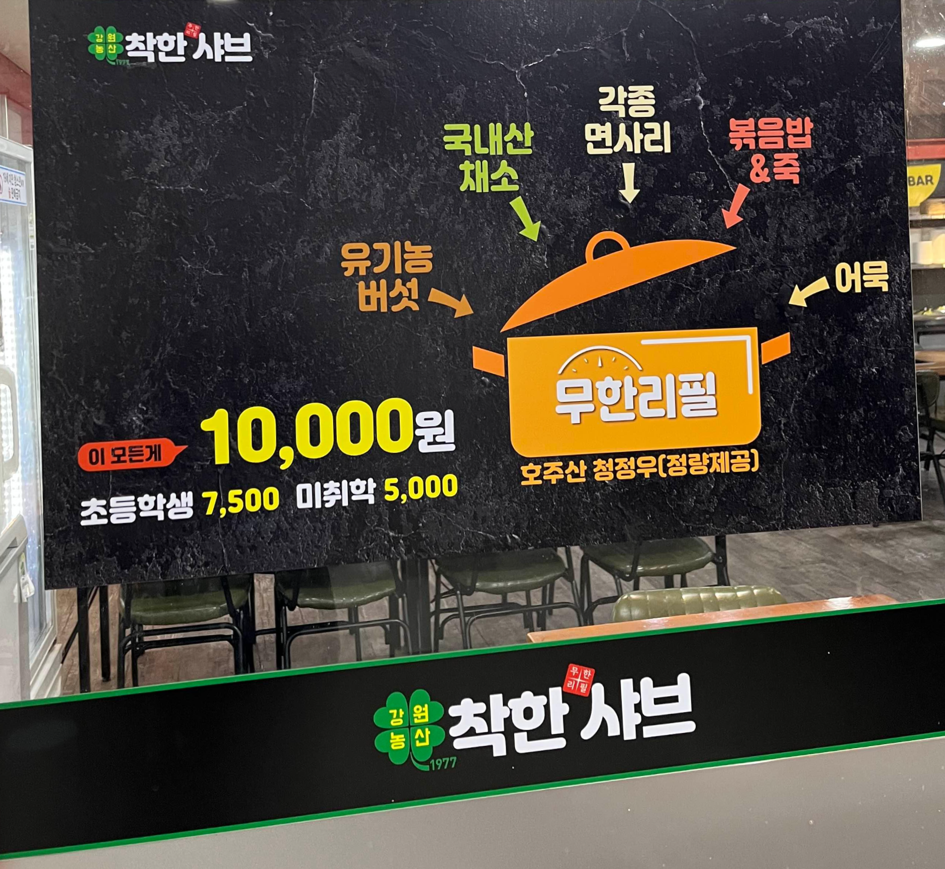 강원농산 착한샤브는 신선한 야채를 무한리필로 마음껏 즐길 수 있는 샤브샤브 맛집입니다. 국내산 채소와 유기농 버섯, 그리고 각종 면사리는 물론 볶음밥과 죽까지 마음껏 먹을 수 있습니다.