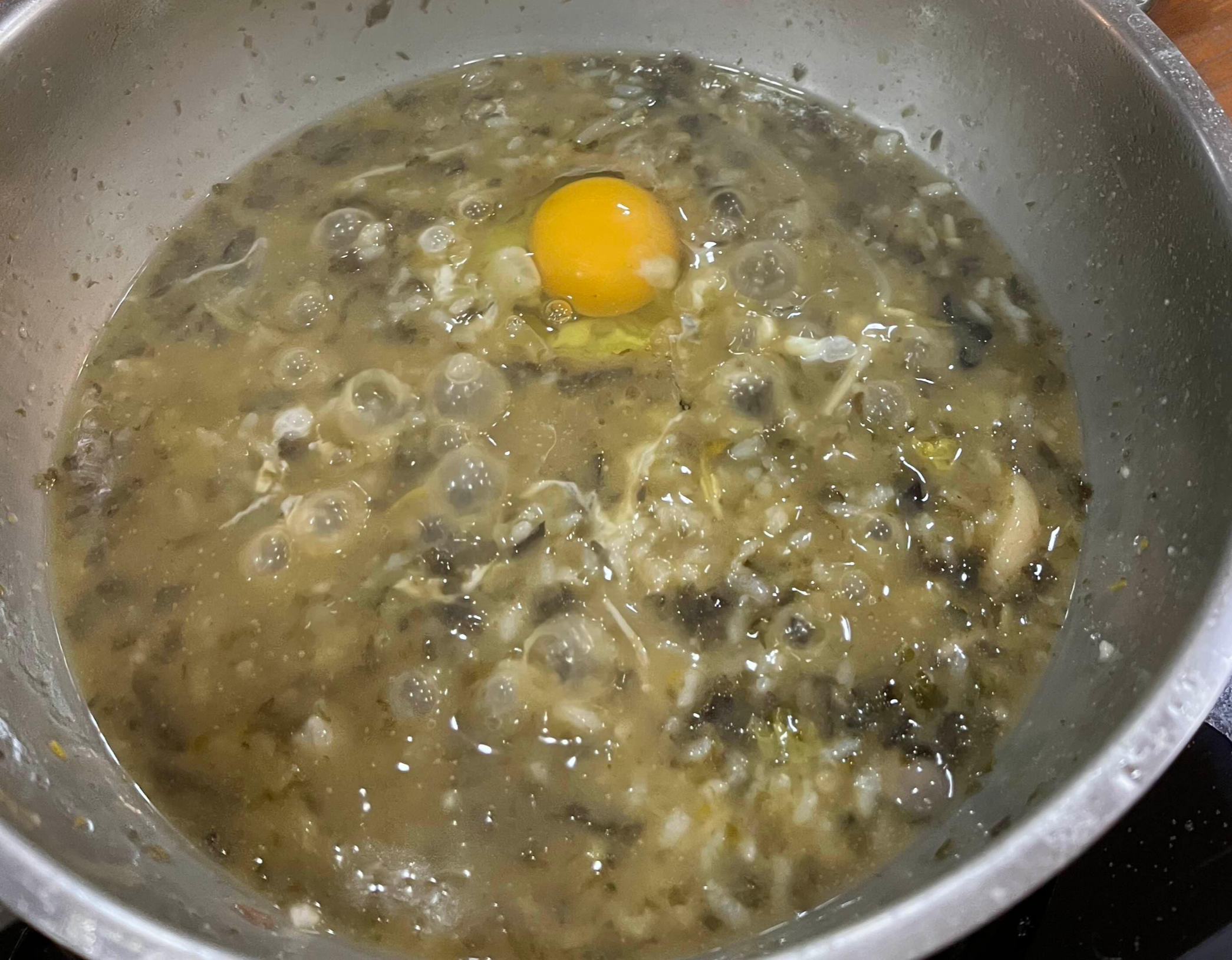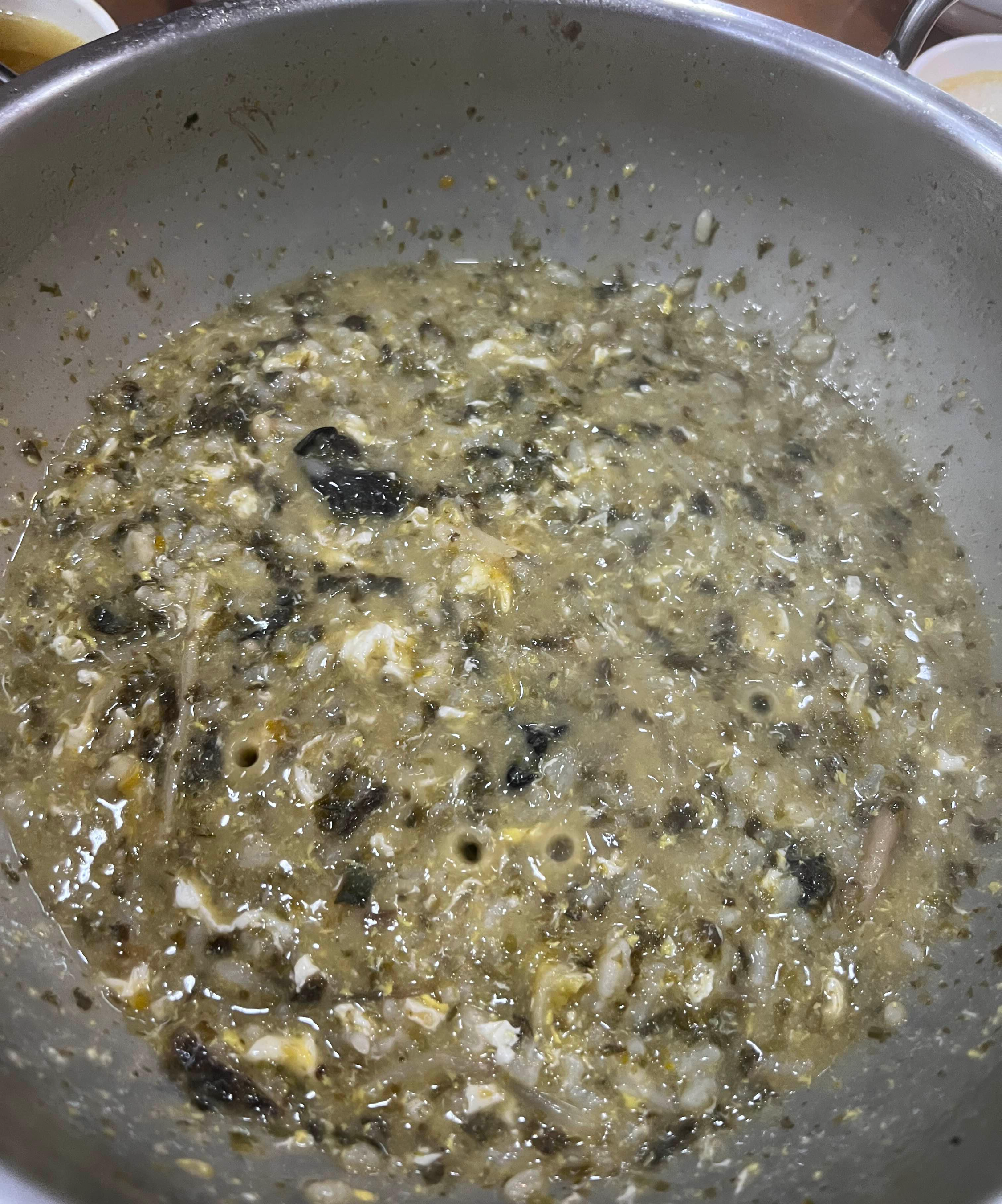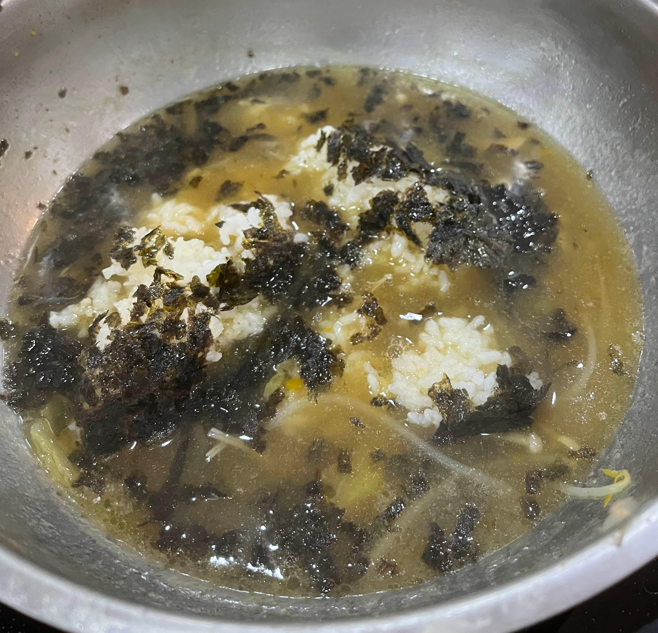 샤브샤브 육수에 참기름을 얹은 밥을 저어주다가 계란 하나를 톡 넣어준 뒤 볶음밥을 완성했어요.
