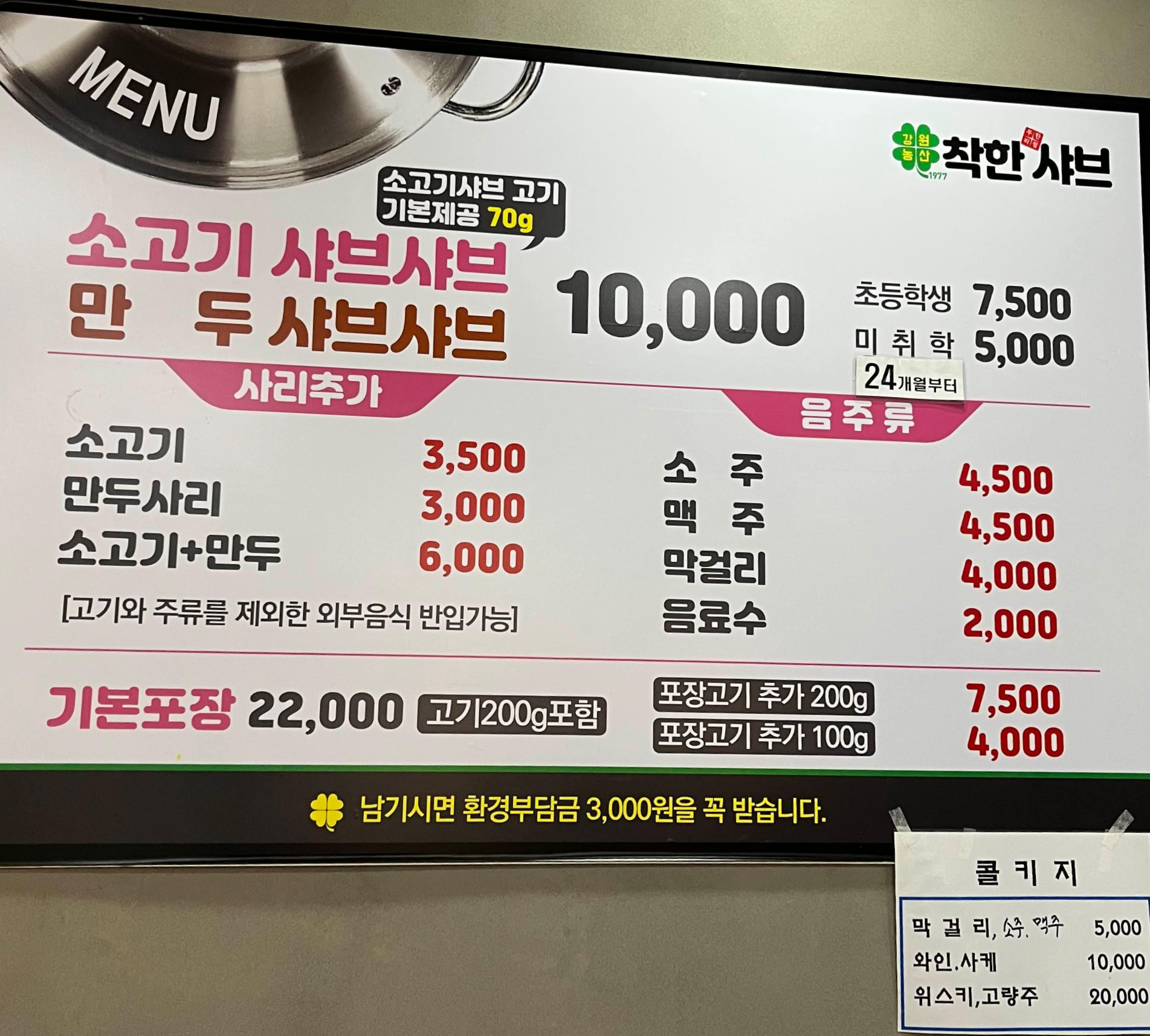 소고기 샤브샤브와 만두 샤브샤브를 먼저 선택하게 되는데요. 소고기 샤브샤브를 선택할 시, 고기는 기본으로 70g이 제공됩니다. 이 모든 것이 성인은 1만 원에, 초등학생과 미취학 아동은 각각 7천5백 원과 5천 원에 식사를 할 수 있는데요.