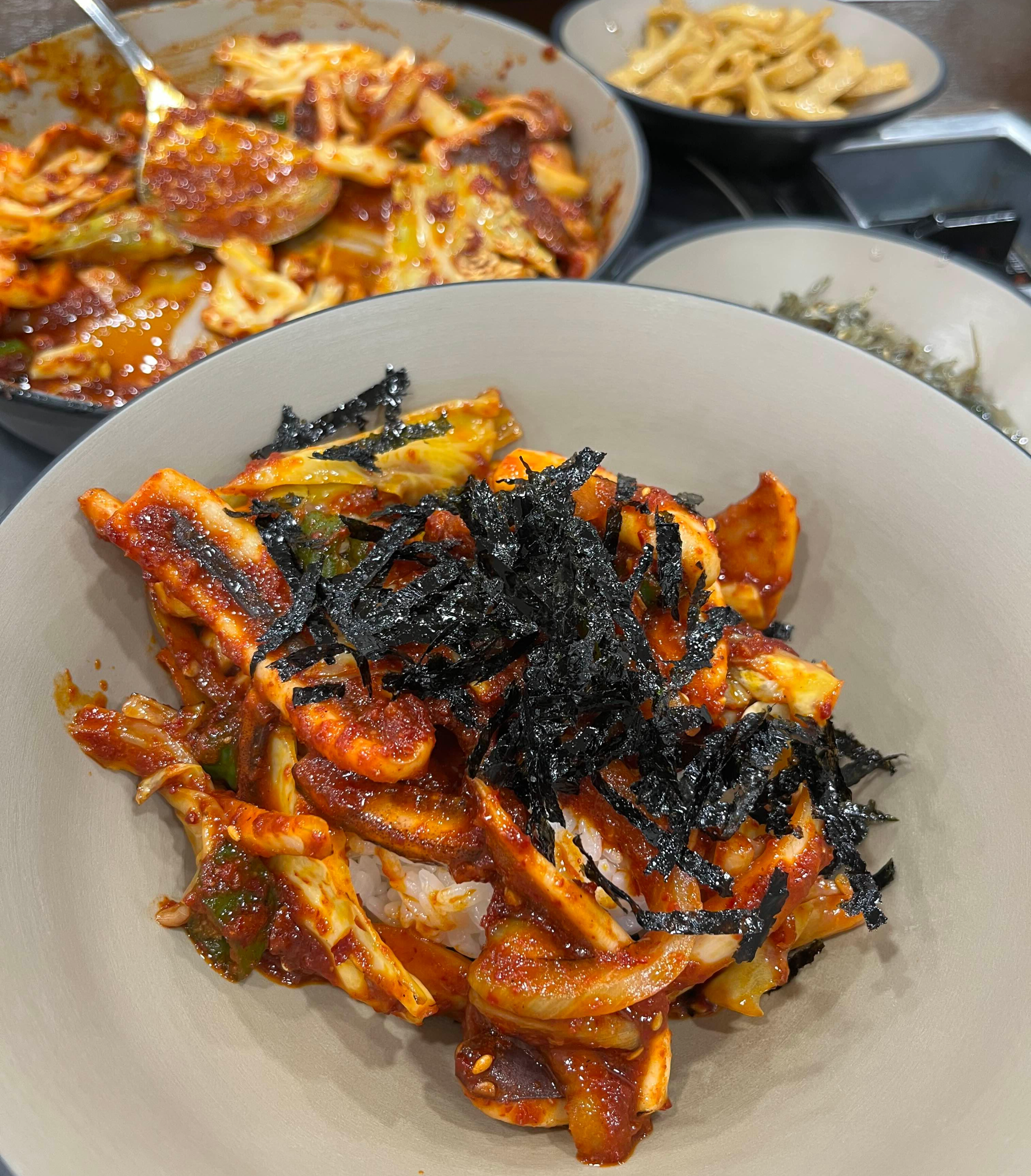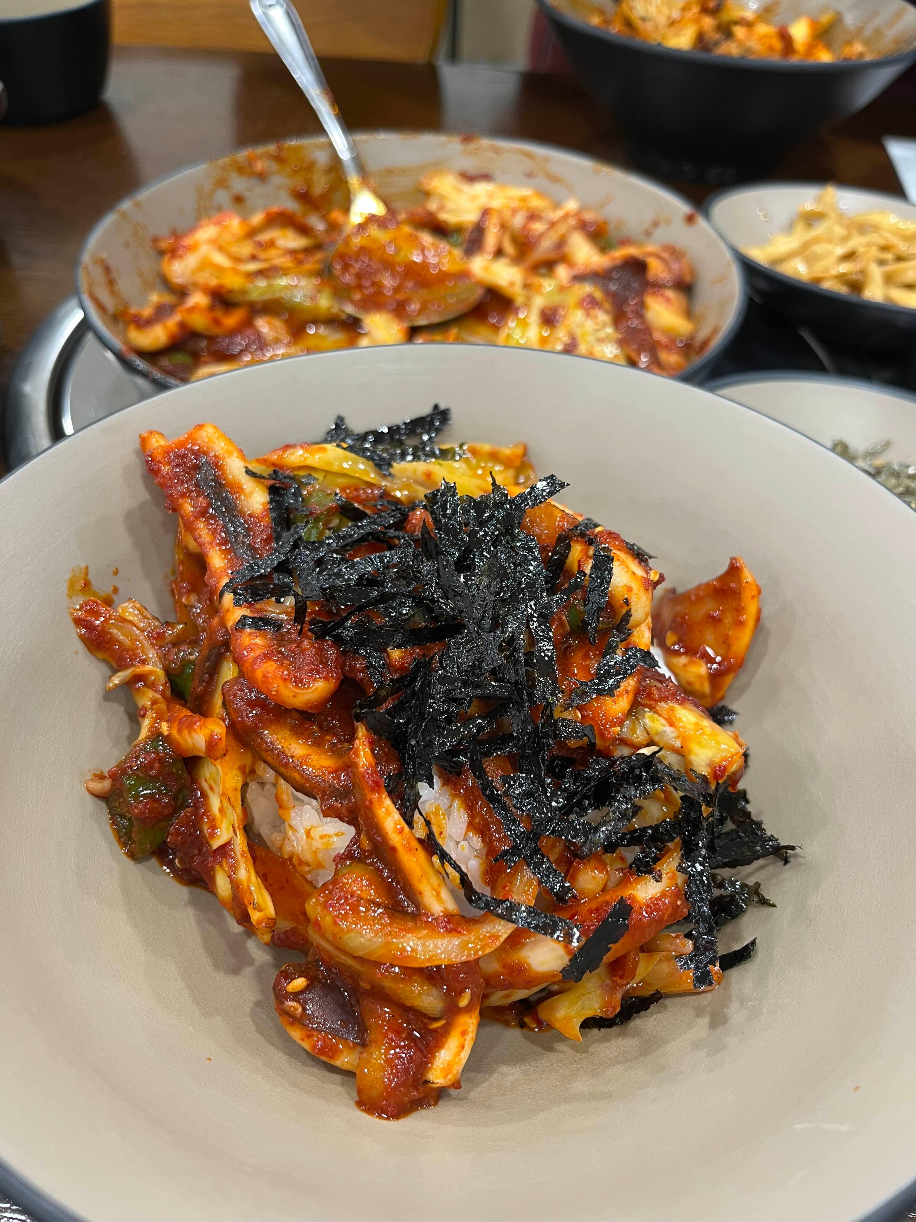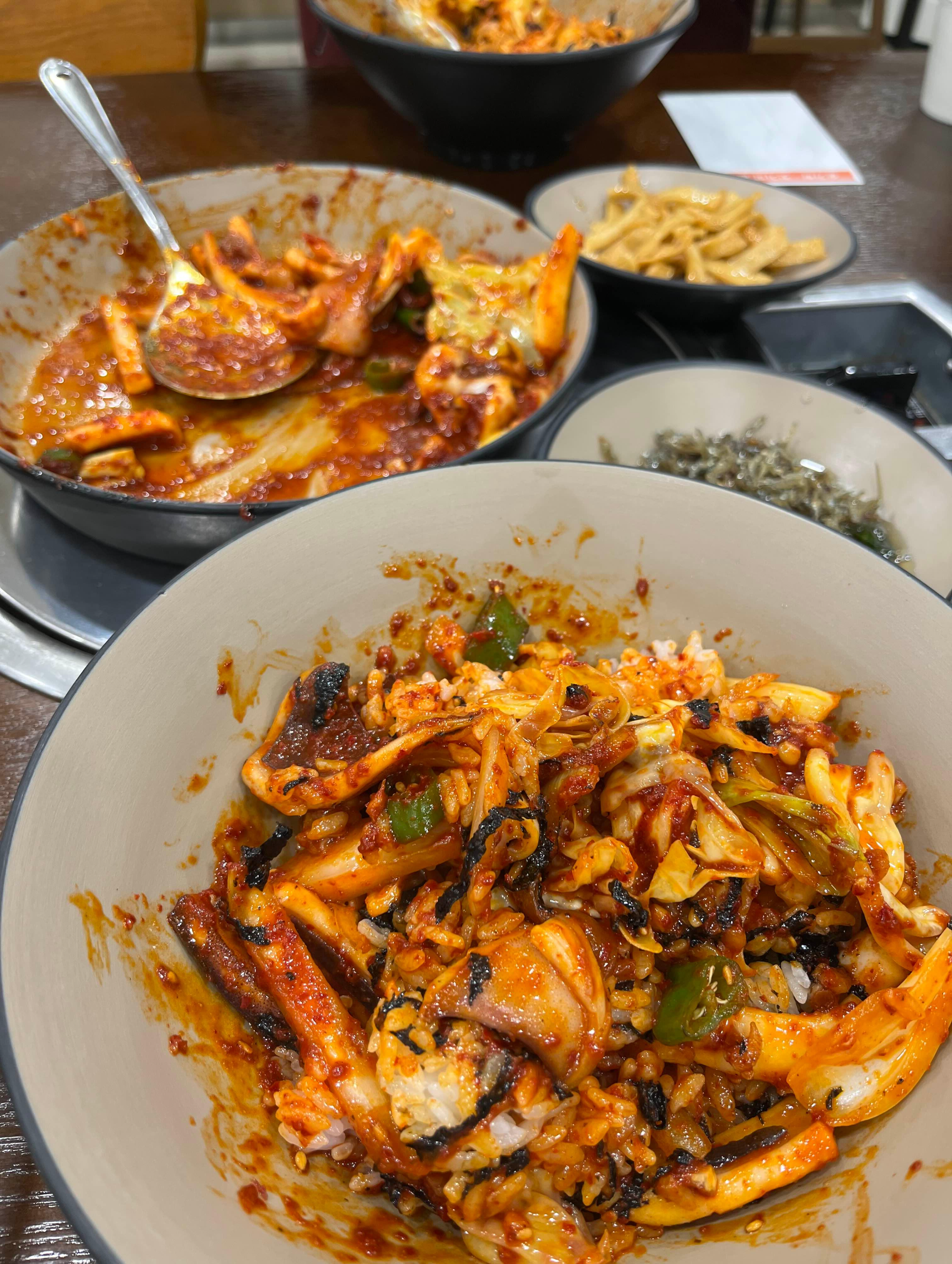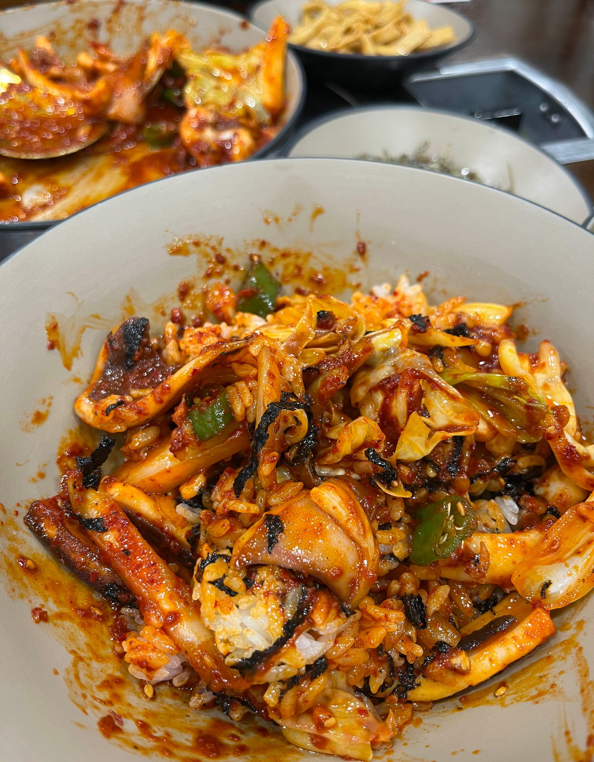 공깃밥을 큰 그릇에 옮겨 오징어볶음을 밥 위에 올린 후에 쓱쓱 비벼 입 안에 넣었더니, 입안 가득 불향이 은은하게 퍼지네요.