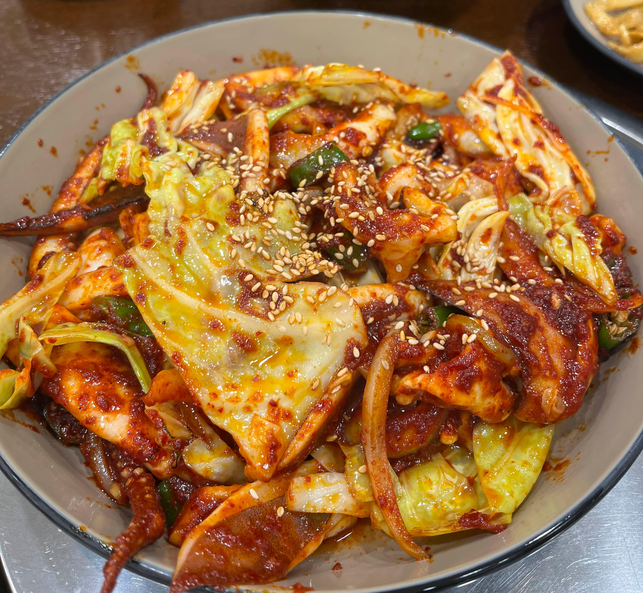 드디어 저희가 주문한 오징어볶음이 나왔네요. 양배추를 크게 썰어 오징어와 함께 볶았어요.