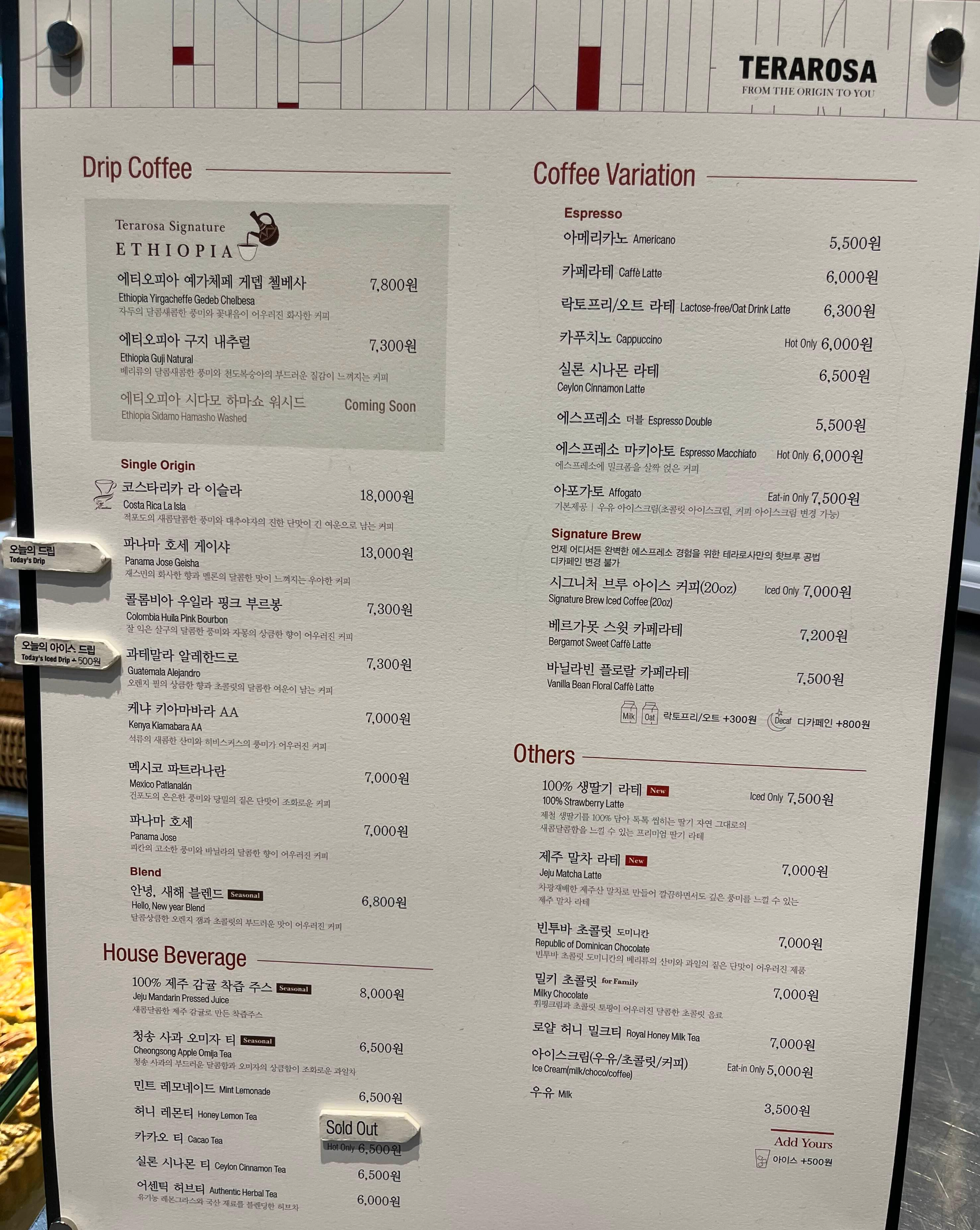 테라로사 서종점의 이날 오늘의 드립 커피는 파나마 호세 게이샤이네요. 남편과 저는 파나마 호세 게이샤와 케냐 키아마바라 AA를 주문했습니다.