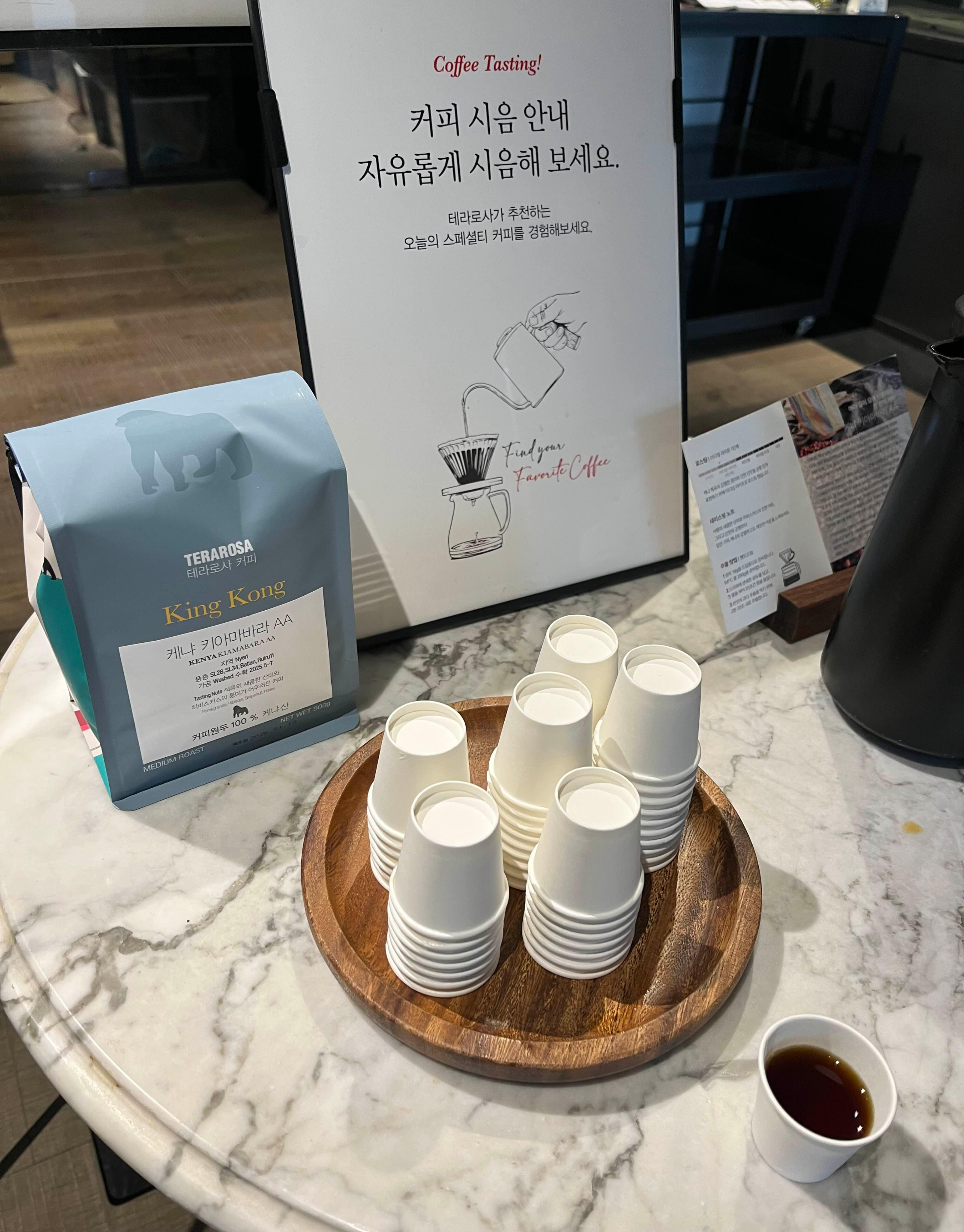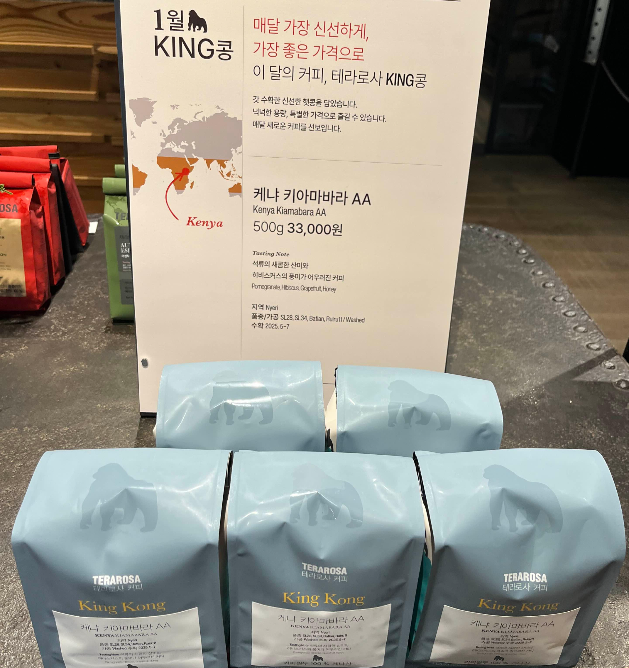 테라로사 서종점에 들어서니 먼저 1월의 커피가 맞아주네요. 1월의 커피는 케냐 키아마바라 AA예요. 산미 있는 커피의 매력을 제대로 느껴보고자 하는 분들에게 잘 어울릴 것 같아요.
