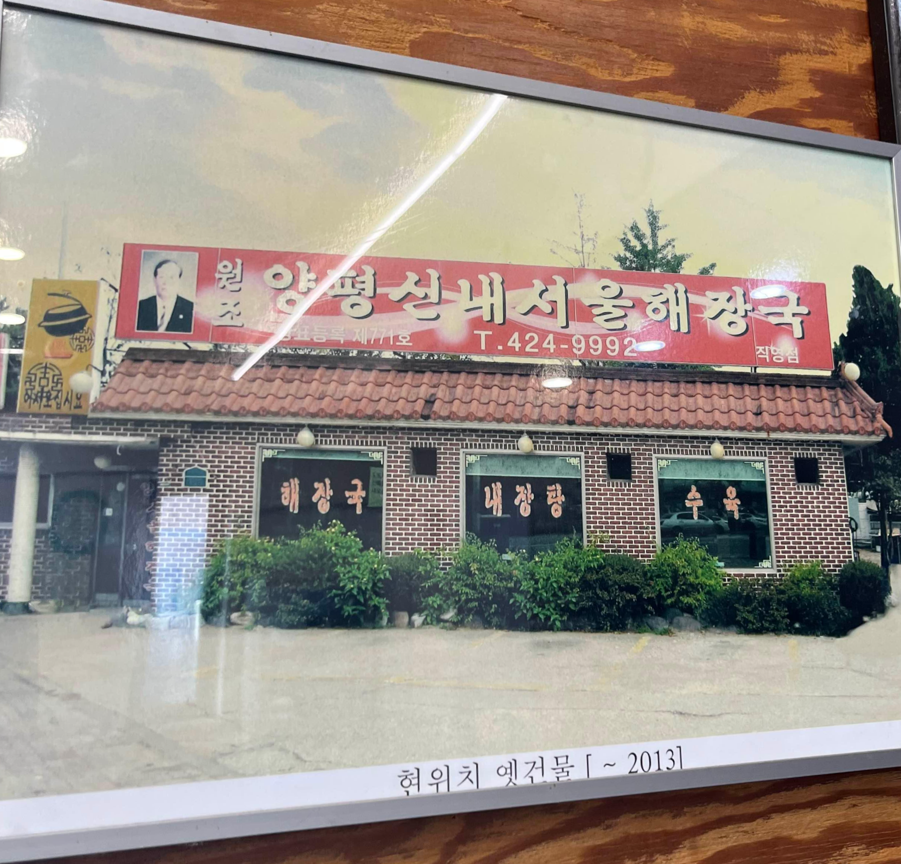 카운터 바로 뒤 벽면에 원조 양평신내서울해장국의 예전 모습 사진이 걸려 있네요. 2013년까지 현 위치에 있었던 옛 건물에서 영업을 했었는데, 그때에는 1층의 주택 같은 분위기였어요. 지금의 식당은 새롭게 신축된 건물입니다.
