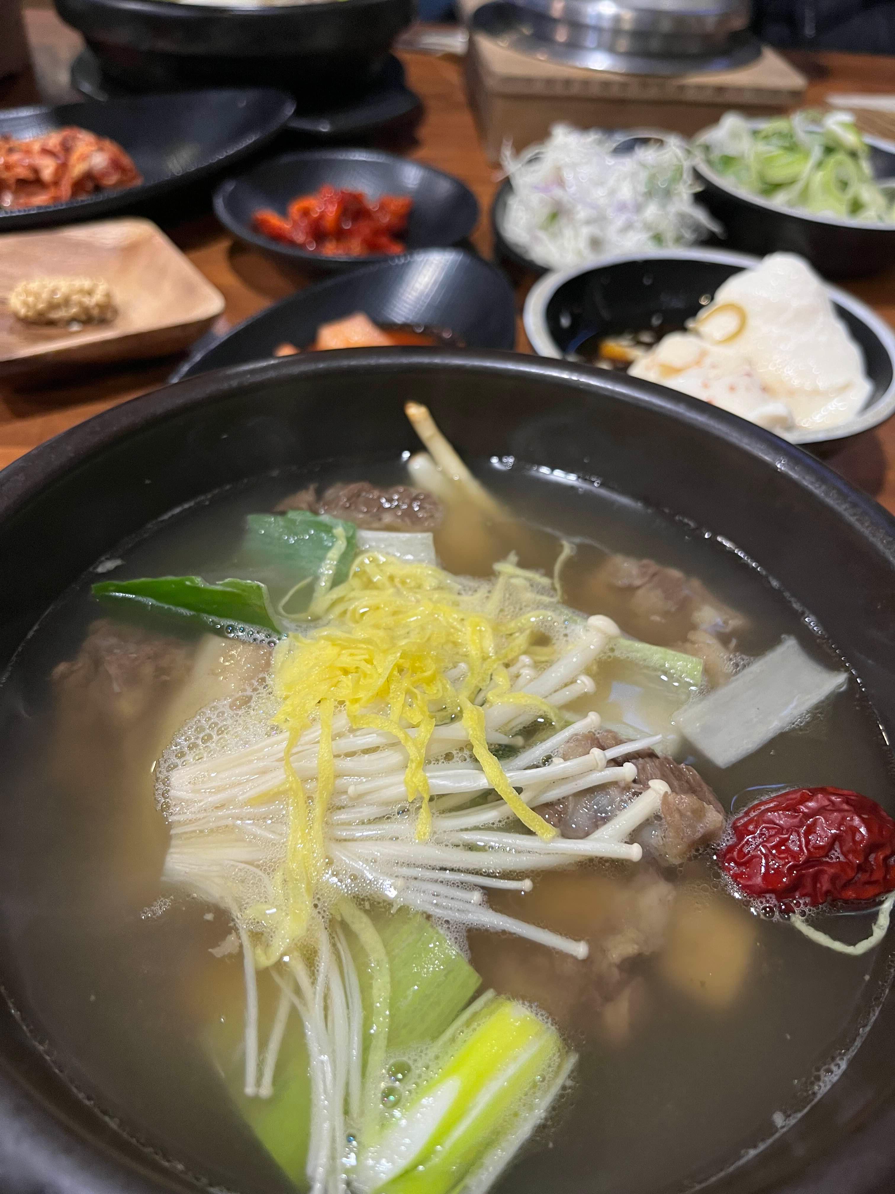 저녁시간대에도 정성담은 손님들이 많더라고요. 빈 테이블이 없어 저희들은 잠시 대기했다가 자리에 앉을 수 있었어요. 갈비탕 종류도 얼큰갈비탕, 매생이갈비탕, 전복갈비탕 등 다양하지만 저희는 모두 맑은갈비탕인 정성담갈비탕에 솥밥으로 주문했습니다.