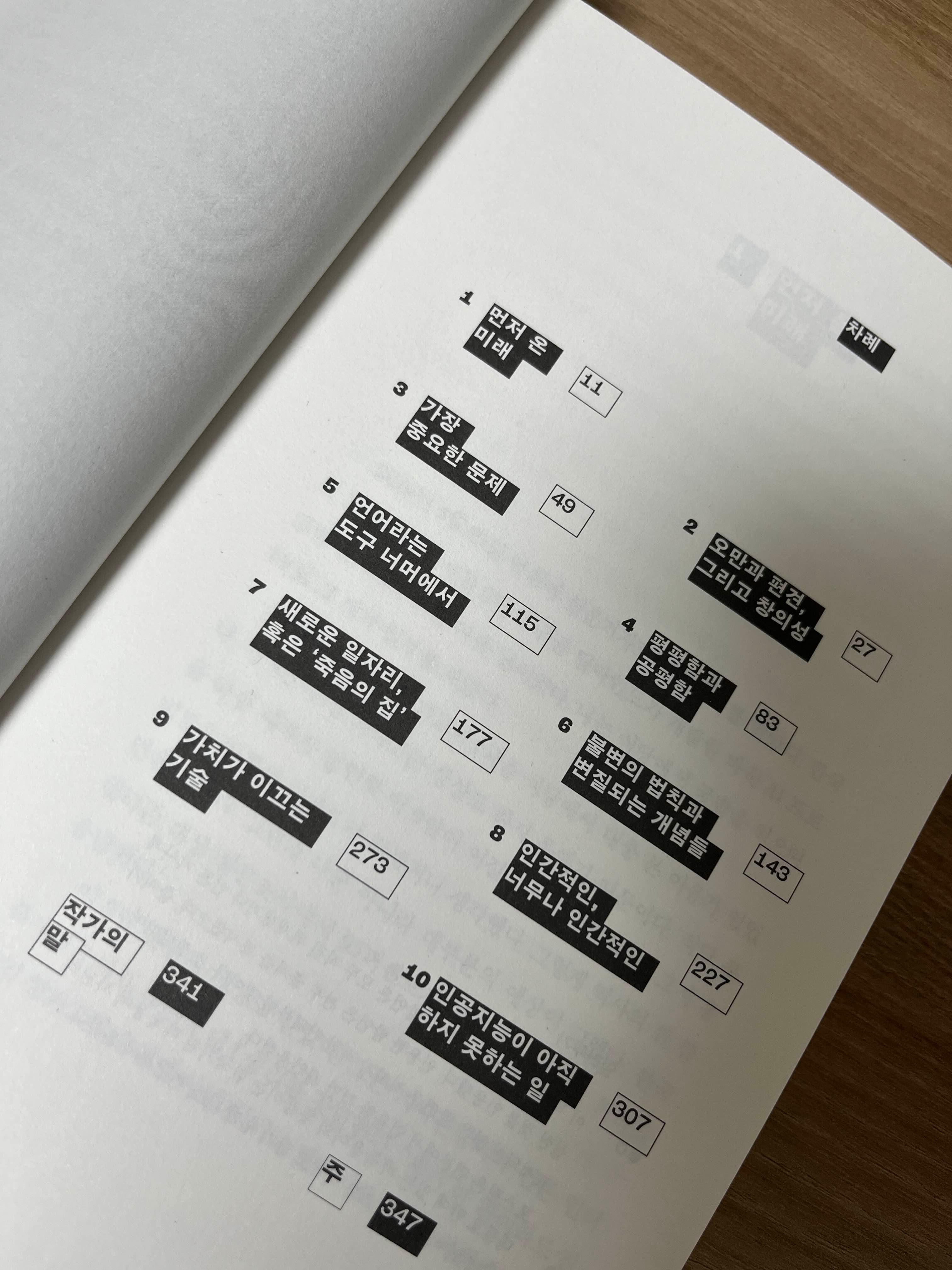 '인공지능은 그저 도구일 뿐이며, 사용 여부는 각자 선택하면 되고, 사용하건 사용하지 않건 각자가 추구하는 가치를 지켜나가면 된다' 같은 말을 하는 사람을 본다. 그들의 순진한 전망은 틀렸다. 인공지능을 사용하지 않더라도, 인공지능을 사용하는 다른 사람들 때문에 내가 추구하는 가치가 변하고 뒤바뀐다. 나를 둘러싼 기술-환경이 바뀌기 때문이다. 내가 다른 사람과 더불어 살아가는 한 그 영향을 받는다. P 187