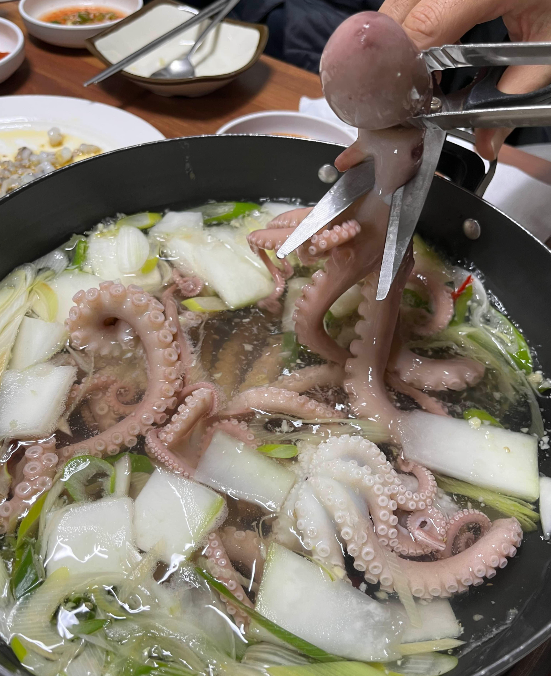 앗~ 곧이어 사장님께서 산낙지가 가득한 그릇을 들고 오셨는데요. 그릇 밖으로 막 넘어가려고 하네요. 저희 식구들 인원수만큼 열두 마리의 낙지가 나왔어요. 박속밀국낙지탕은 1인분이 2만 원인데요. 수제비와 칼국수가 포함된 가격이라고 하네요.