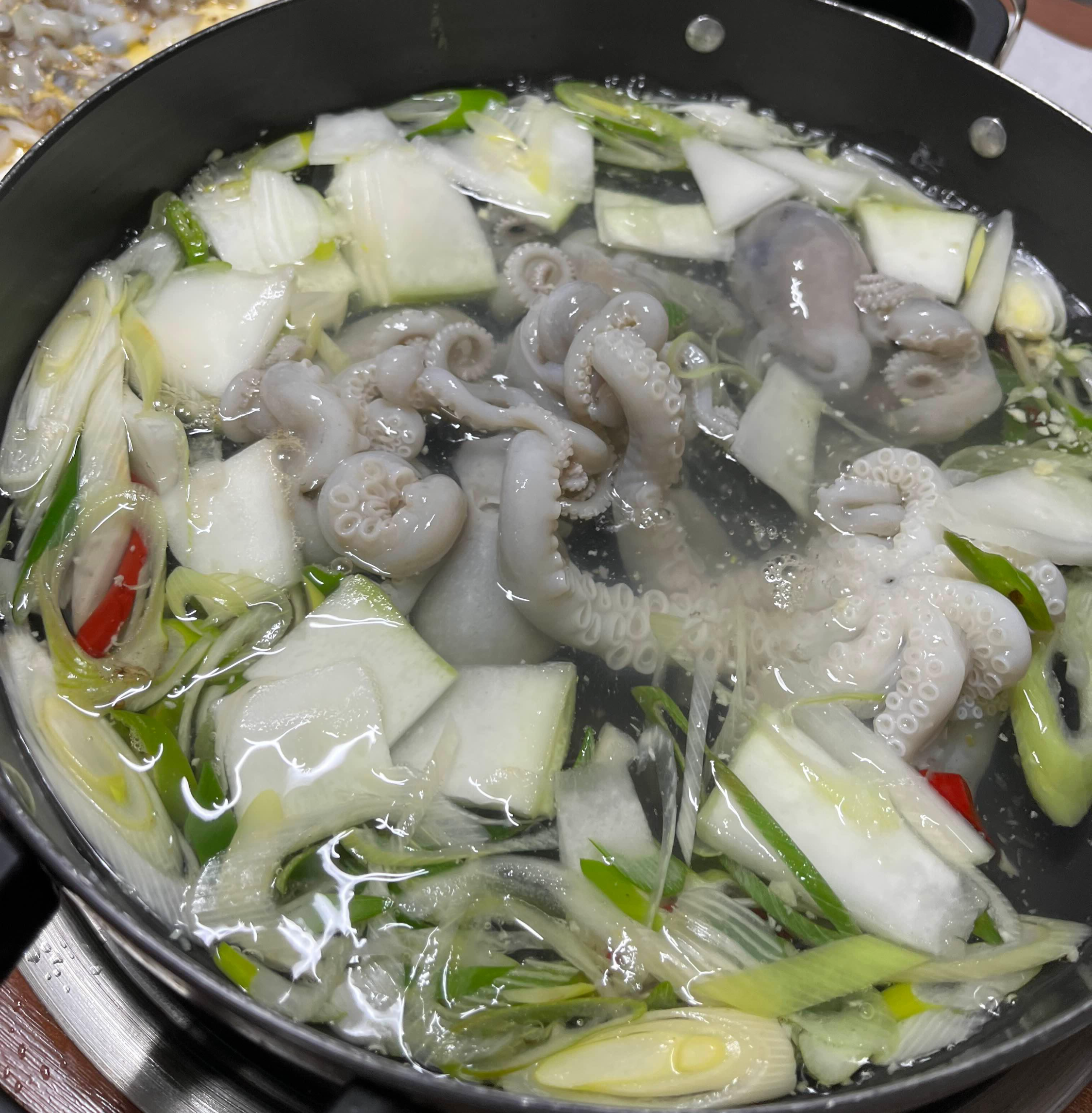 자리에 앉자마자 박속밀국낙지탕을 끓일 준비가 시작되네요. 박속은 박의 안에 씨가 박혀 있는 하얀 부분을 가리키는 말인데요. 조카들은 처음에 박속이 무인줄 알았다고 해요.