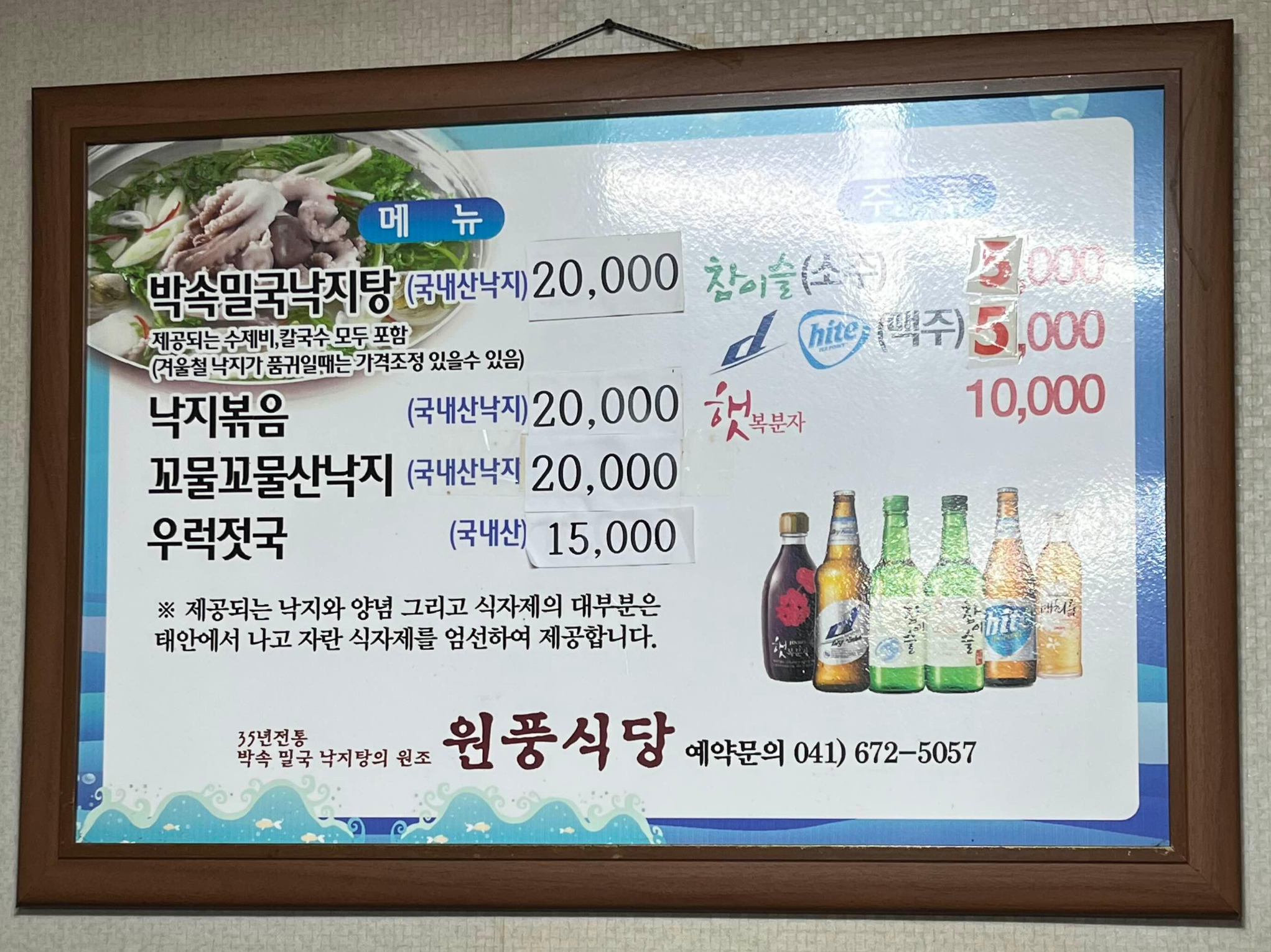 원풍식당의 메뉴는 박속밀국낙지탕과 낙지볶음, 꼬물꼬물산낙지, 우럭젓국 등 딱 네 가지뿐이었어요. 원풍식당에서 제공되는 낙지와 양념, 그리고 식자재의 대부분은 태안에서 나고 자란 식자재를 엄선하여 제공한다고 합니다.
