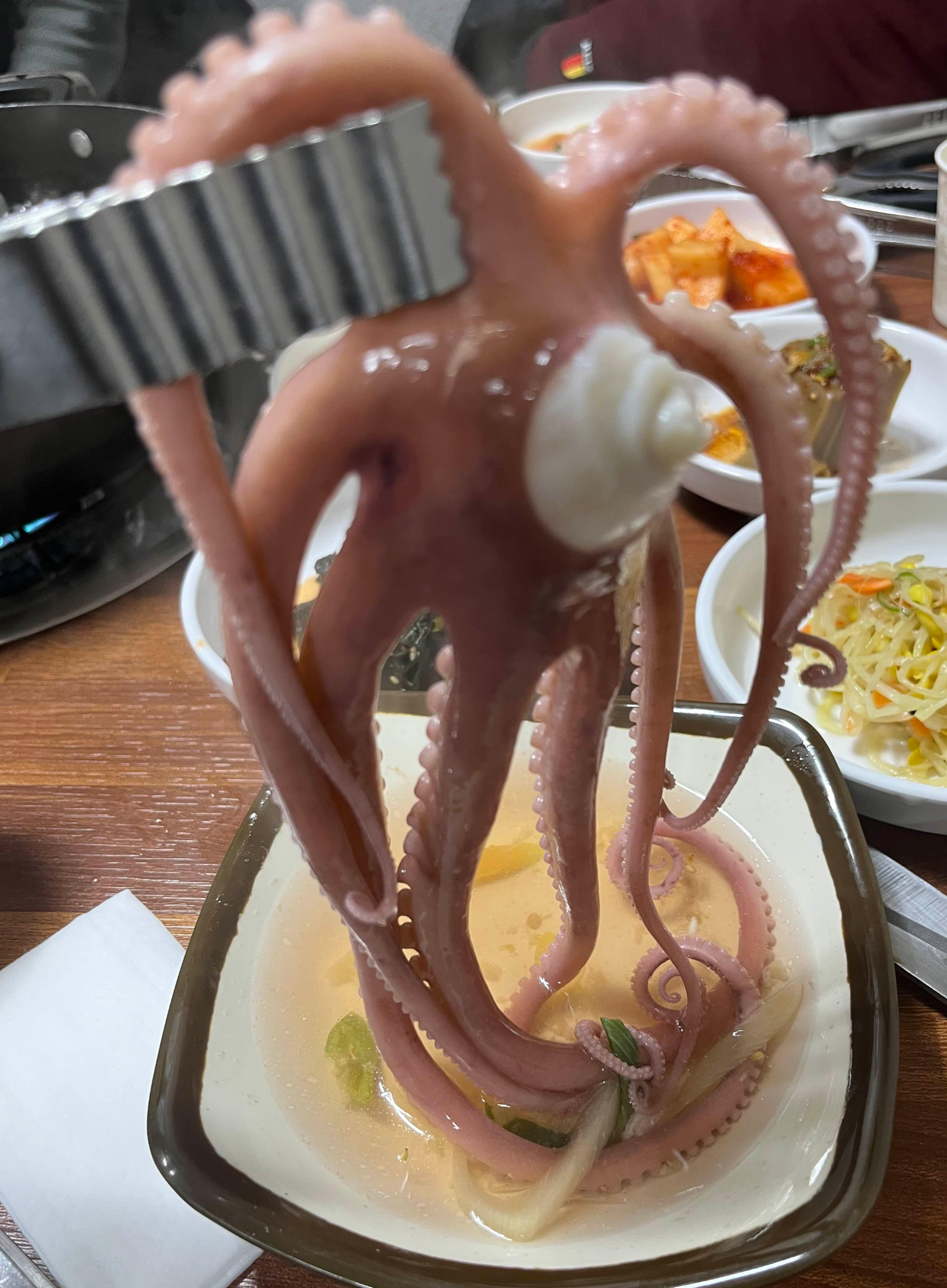 꼬물꼬물산낙지가 식구들이 앉은 각 테이블에 한 접시씩 올라가 꼬물꼬물거리고 있네요.