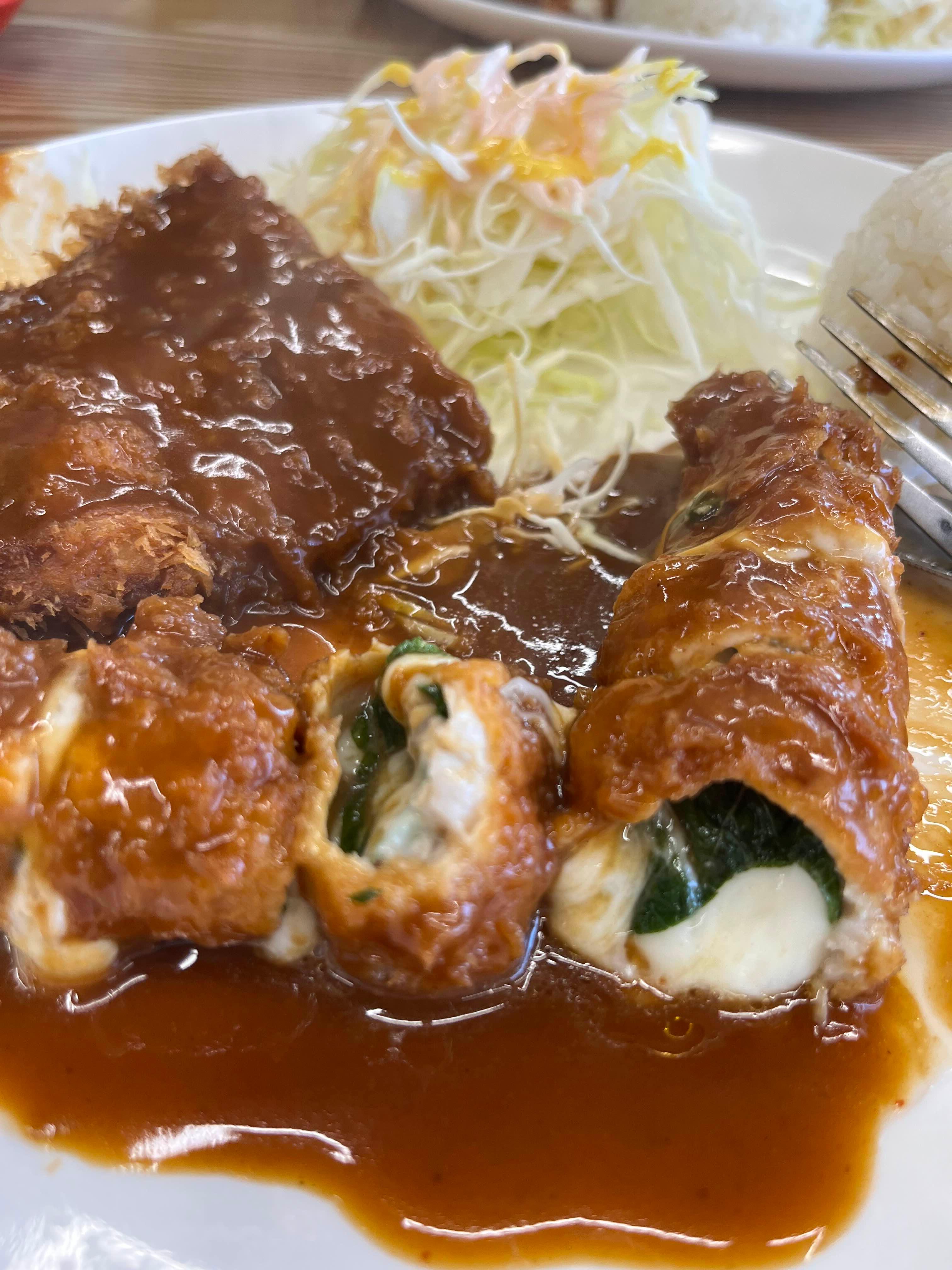 치즈돈가스는 마치 김밥과 같은 비주얼이었는데, 그 맛이 다른 곳과는 조금 달랐다. 치즈를 깻잎이 둘러싸고 있어서 느끼함이 전혀 느껴지지 않는 독특한 맛이었다.