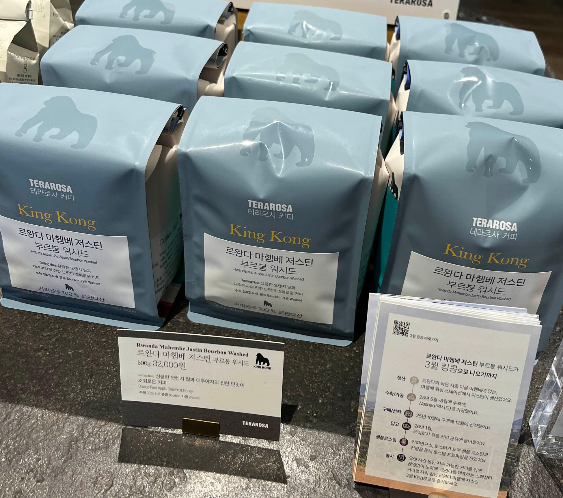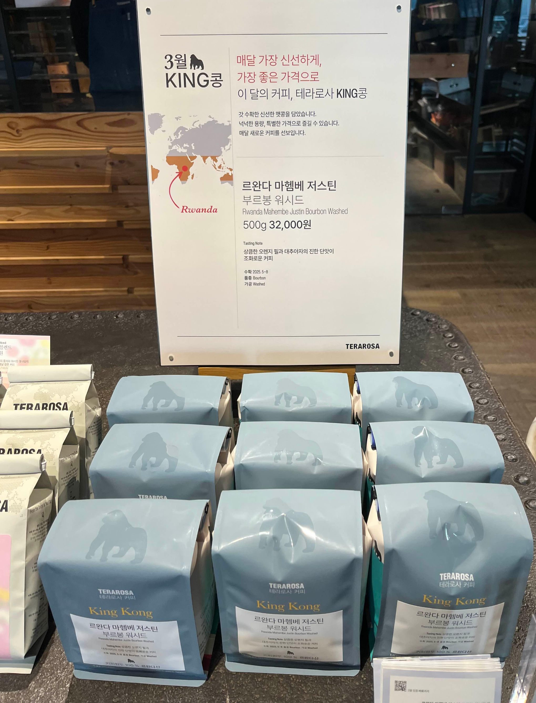 테라로사 서종점에 들어서니, 바로 3월 KING콩이 먼저 맞아줍니다. 그 주인공은 바로 르완다 마헴베 저스틴 부르봉 워시드입니다. 르완다 마헴베 저스틴은 신뢰로 이어 온 르완다 스페셜티 커피의 상징이라 할 수 있는데요.